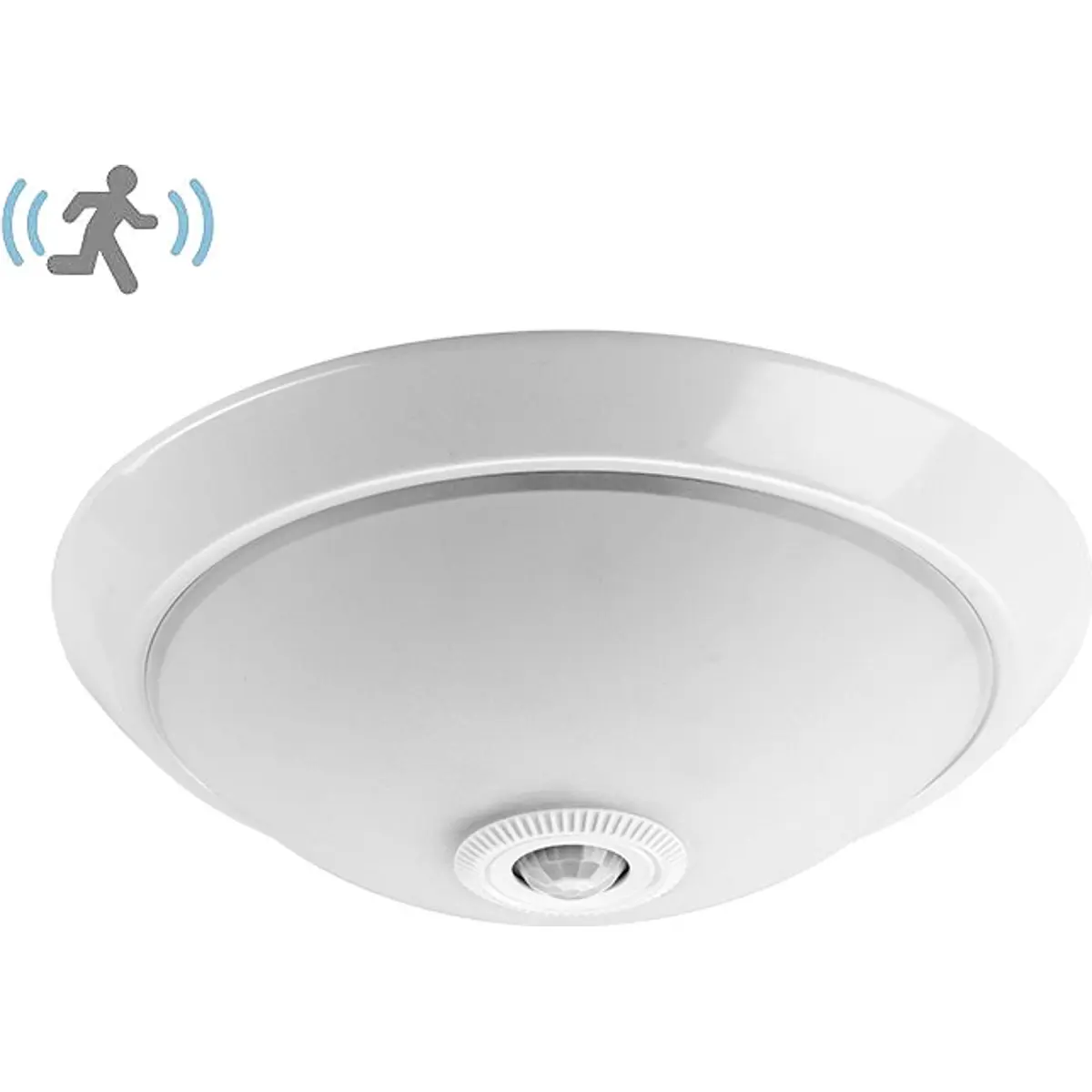 Plafon com alimentação 230 V AC e sensor PIR de 360º para teto, aceitando duas lâmpadas E27. O sensor crepuscular funciona entre 3 e 2000 lux e o tempo de iluminação varia entre 10 s e 3 minutos. O alcance de detecção é de 120º a 360º, oferecendo iluminação eficiente e económica para espaços interiores. Dimensões Ø310x95 mm.