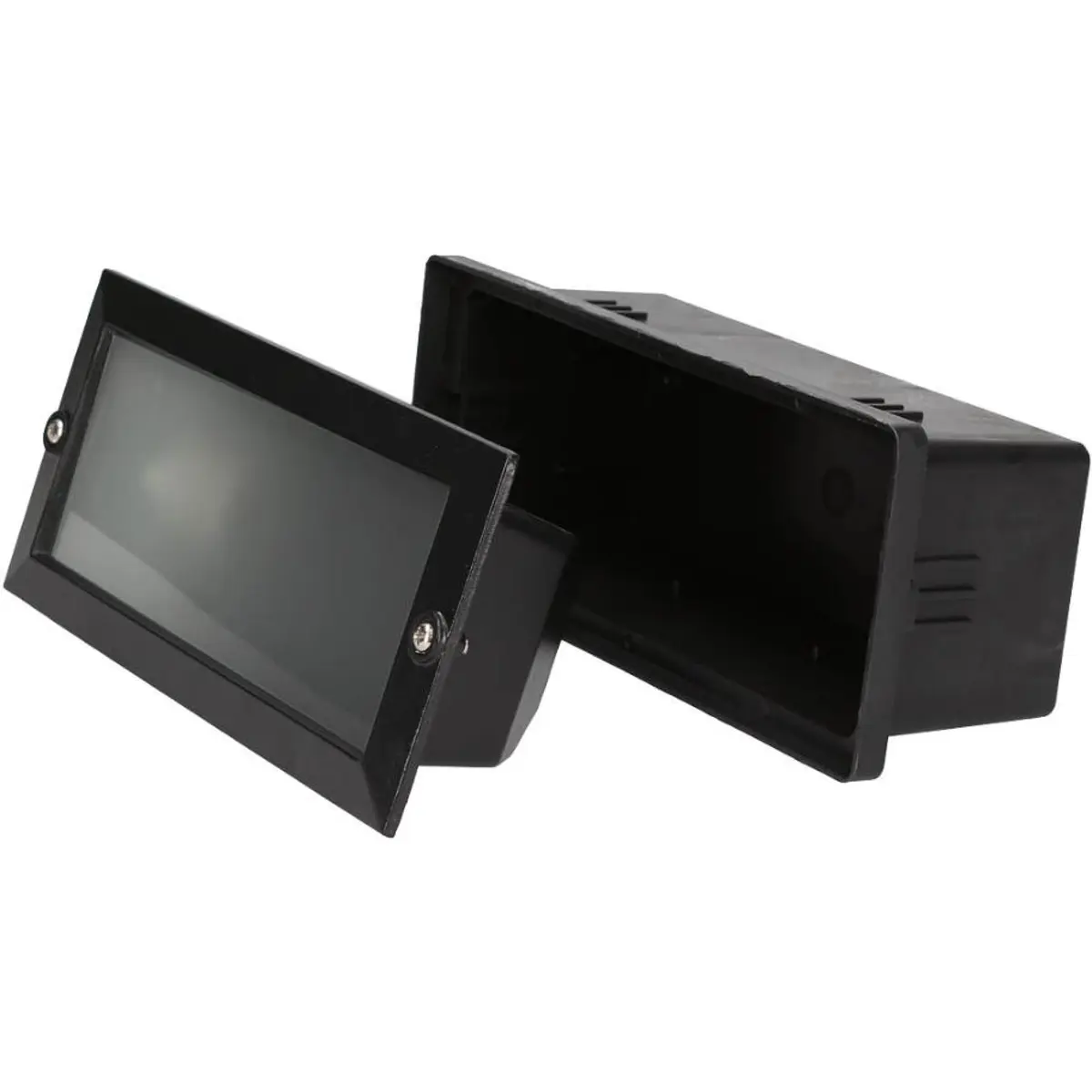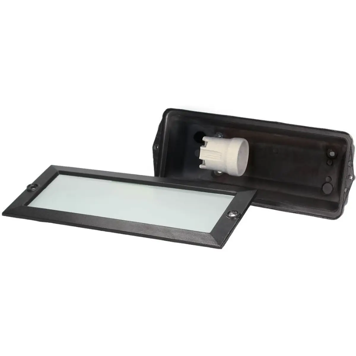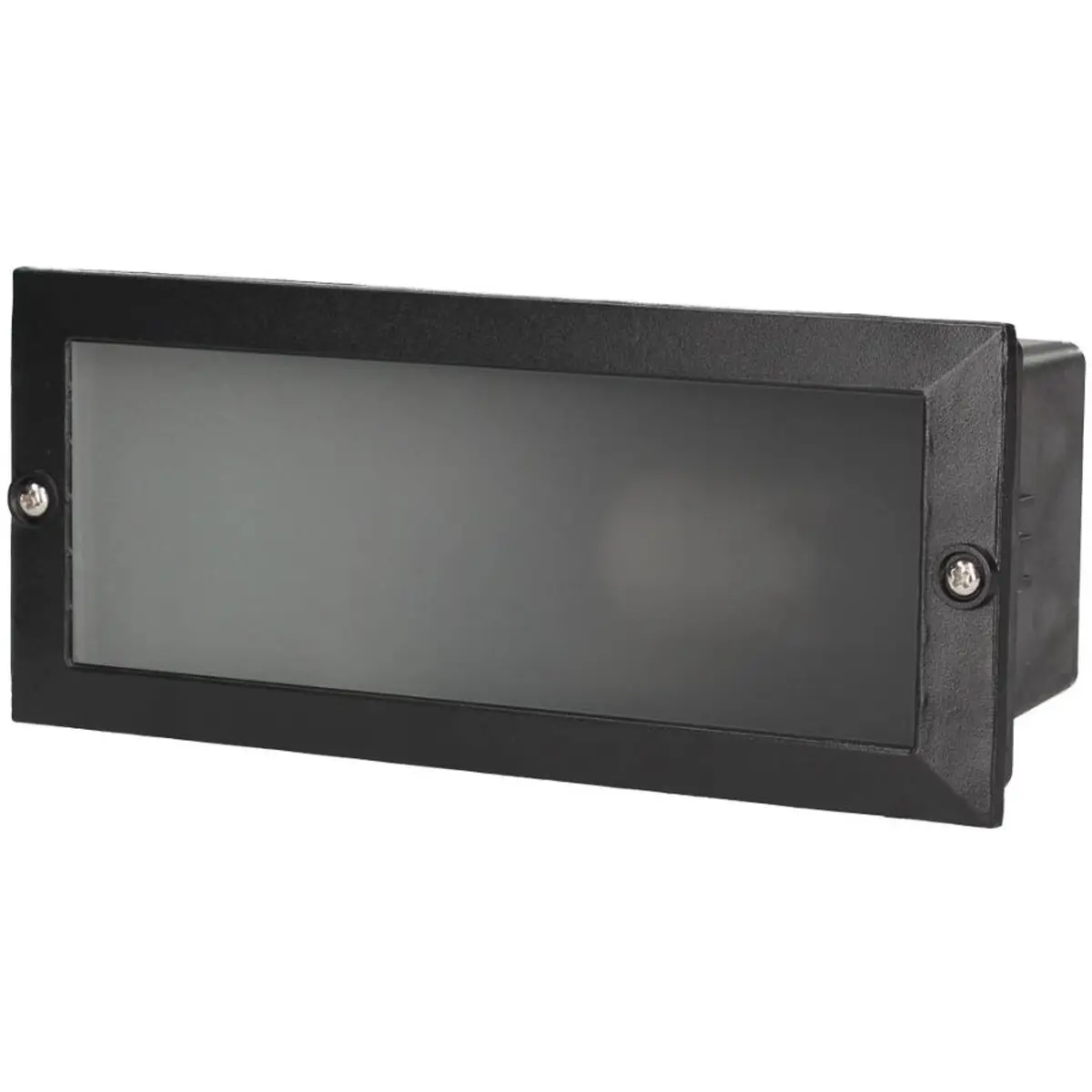 Luminária de embutir de parede com soquete E27, compatível com lâmpadas LED, potência máxima de 60W e proteção IP54. Funciona a 230V, 50/60Hz. Instalação na parede com difusor em PC e base de alumínio, na cor preta. Dimensões de 230 x 80 x 80 mm, oferecendo iluminação discreta e fiável com robustez e resistência a pó e respingos.
