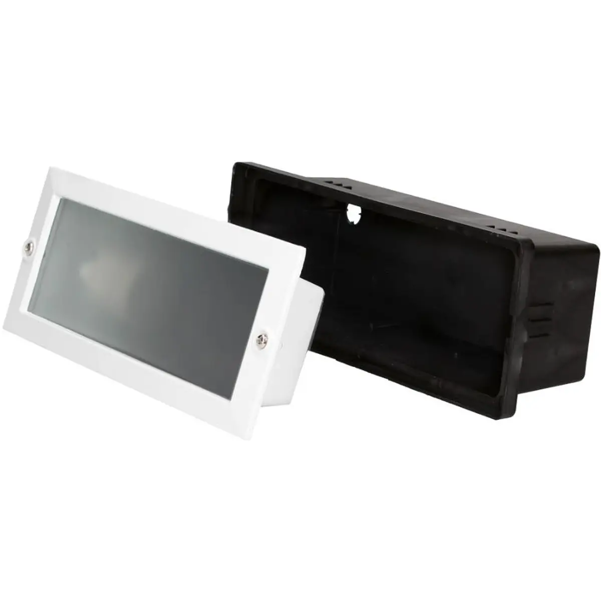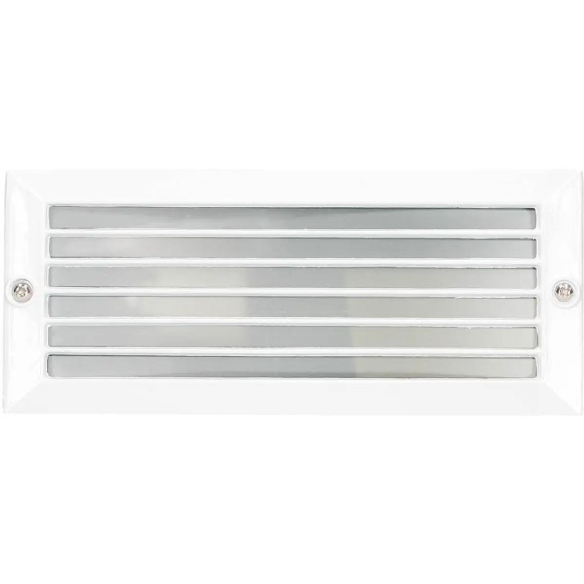 Esta luminária de embutir de parede com grelha é compatível com lâmpada LED, usa o soquete E27 e tem classificação IP54, protegendo contra poeira e salpicos de água. Oferece potência máxima de 60W com alimentação de 230V e 50/60Hz. O difusor em PC proporciona luz uniforme; a base em alumínio confere durabilidade e o acabamento é branco. Instalação na parede; lâmpada não incluída.