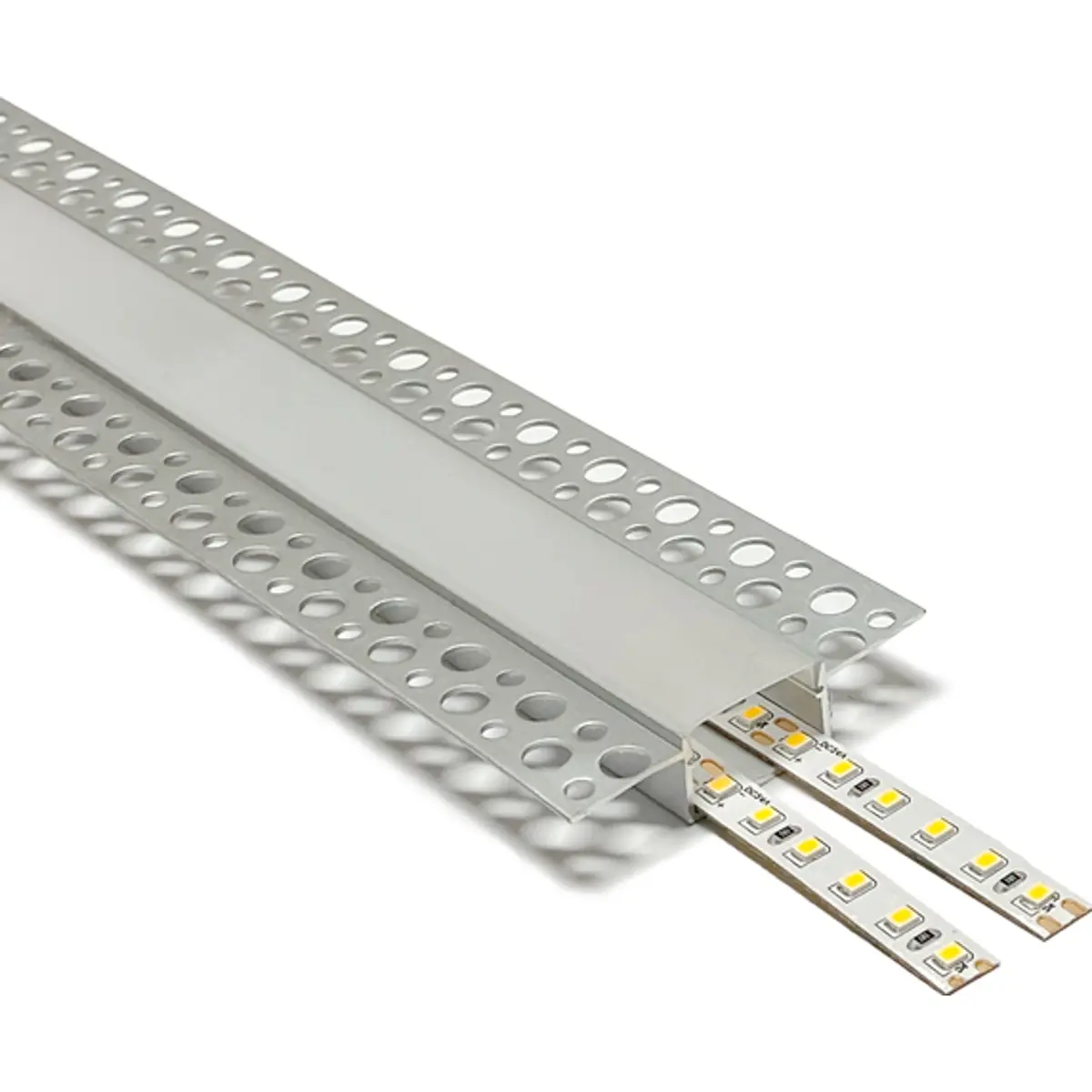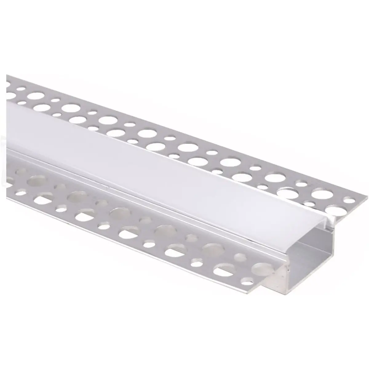 Perfil de alumínio para embutir em gesso cartonado com difusor opalino para fita LED, de 2 m de comprimento. Possui largura total de 62 mm, largura interior de 20 mm e altura de 15 mm. Ideal para instalações em drywall, oferecendo acabamento discreto com difusor que suaviza a iluminação. Compatível com fita LED padrão, fácil montagem embutida, leve e resistente, mantendo um aspecto moderno em interiores.