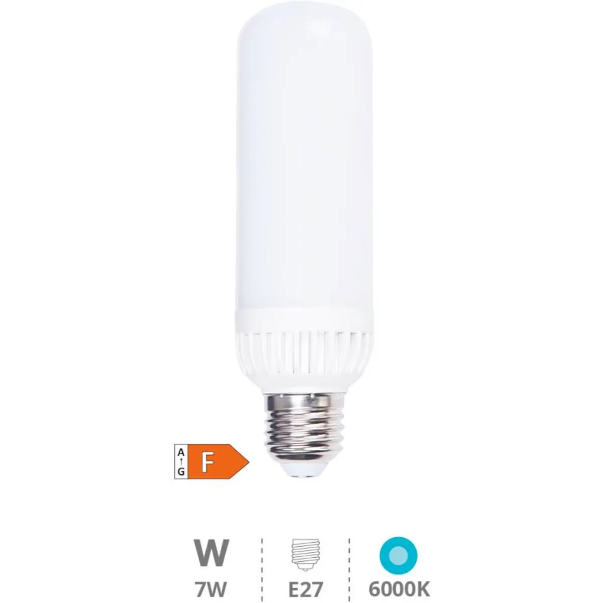 Lâmpada LED tipo cornlight com casquilho E27, funcionamento entre 175-265 V AC (50/60 Hz) e 7 W de potência. Fornece 800 lm com ângulo de emissão de 360º e temperatura de cor 6000 K (luz fria). Acendimento instantâneo (<0,5 s) com 100% de luminosidade. CRI ≥ 0,80, corrente de 53 mA, até 100.000 ciclos de comutação, IP20, vida útil de até 25.000 horas, dimensões Ø45 x 100 mm.
