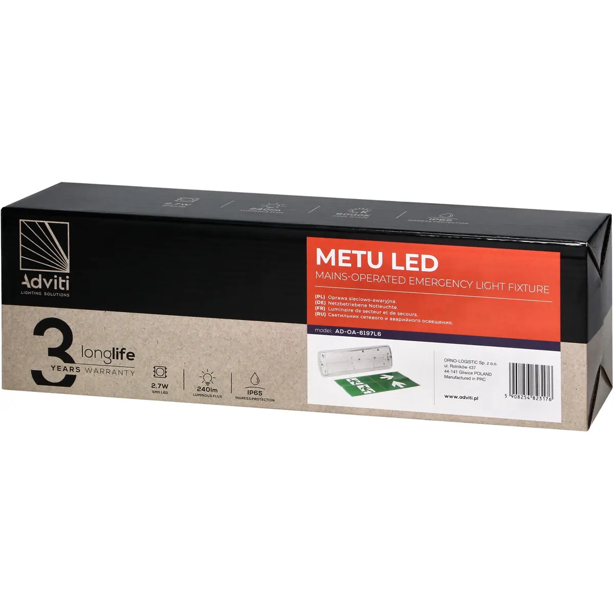 A METU LED 2.7W é uma luminária de emergência que funciona em modo de rede e de emergência.