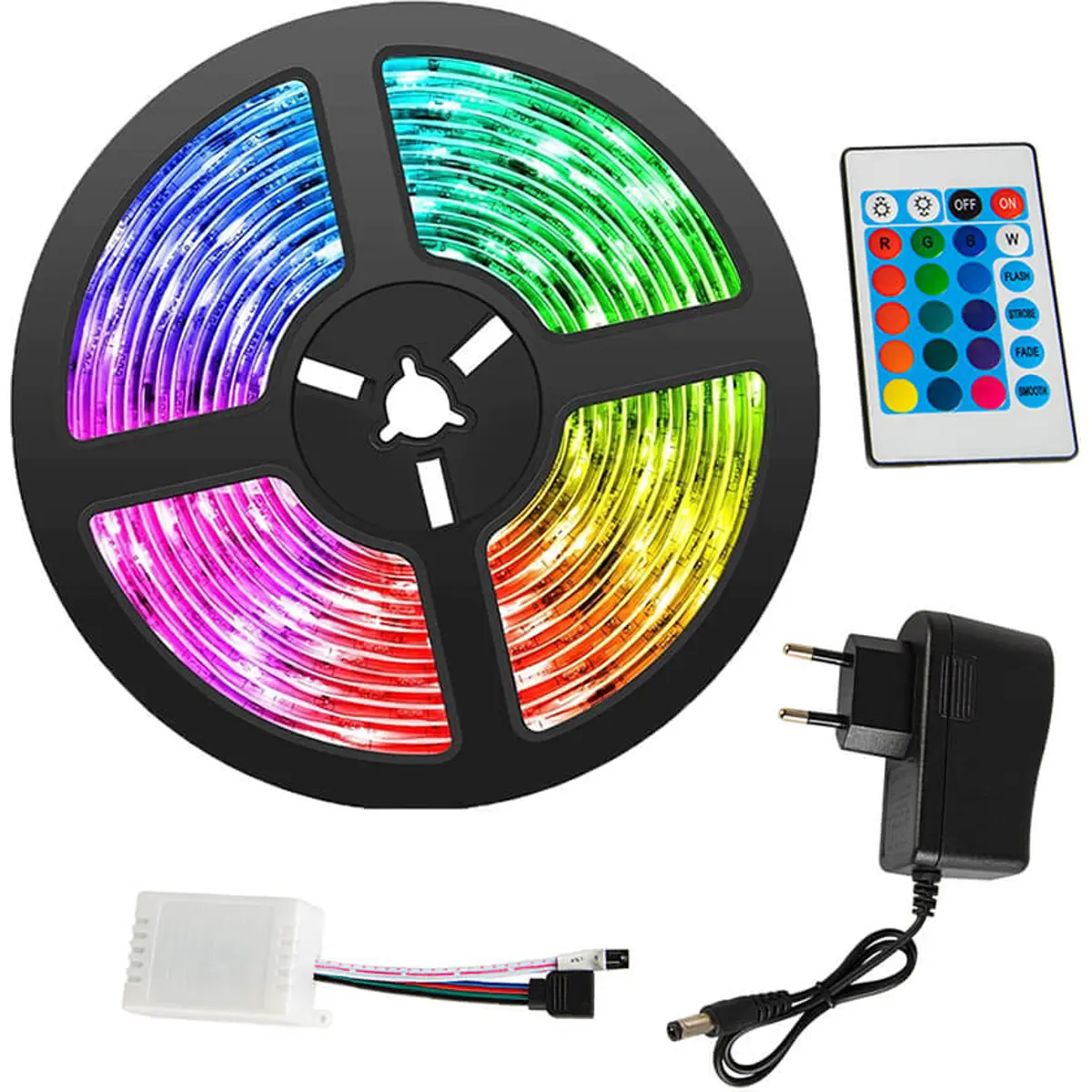 Kit completo de fita de LED RGB 12V 140lm/m (300 LEDs) IP65 5m + alimentador + controlador RGB + Comando