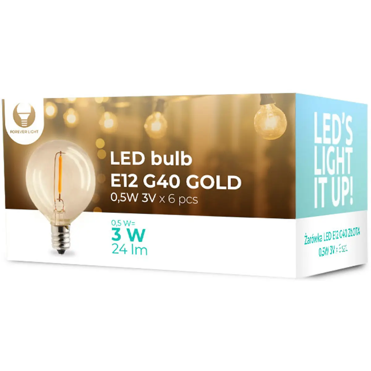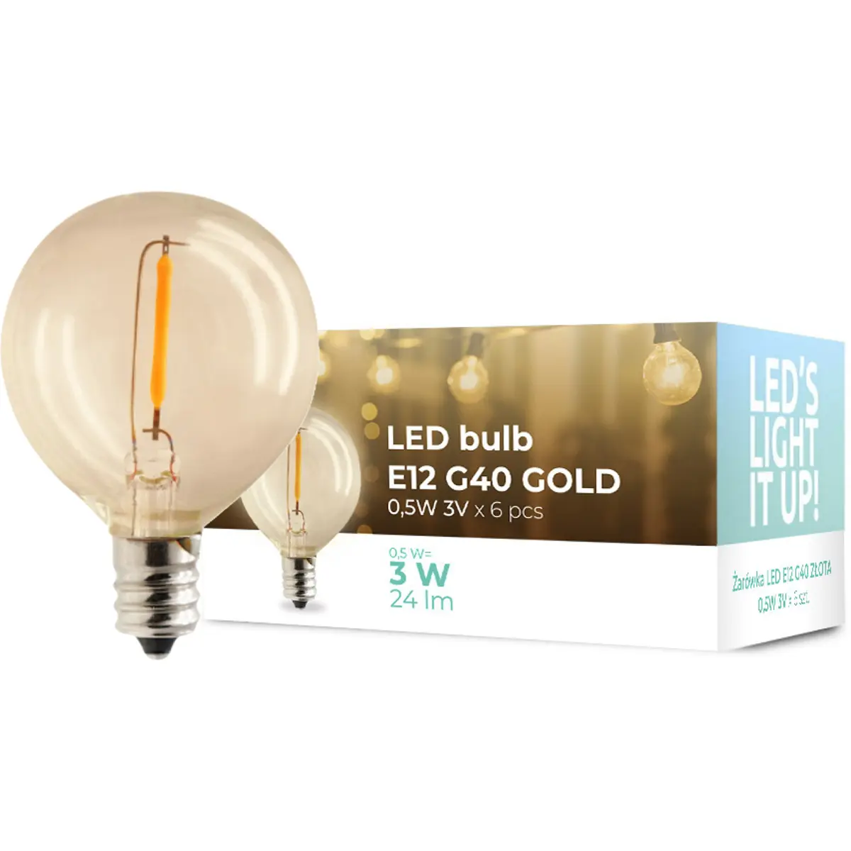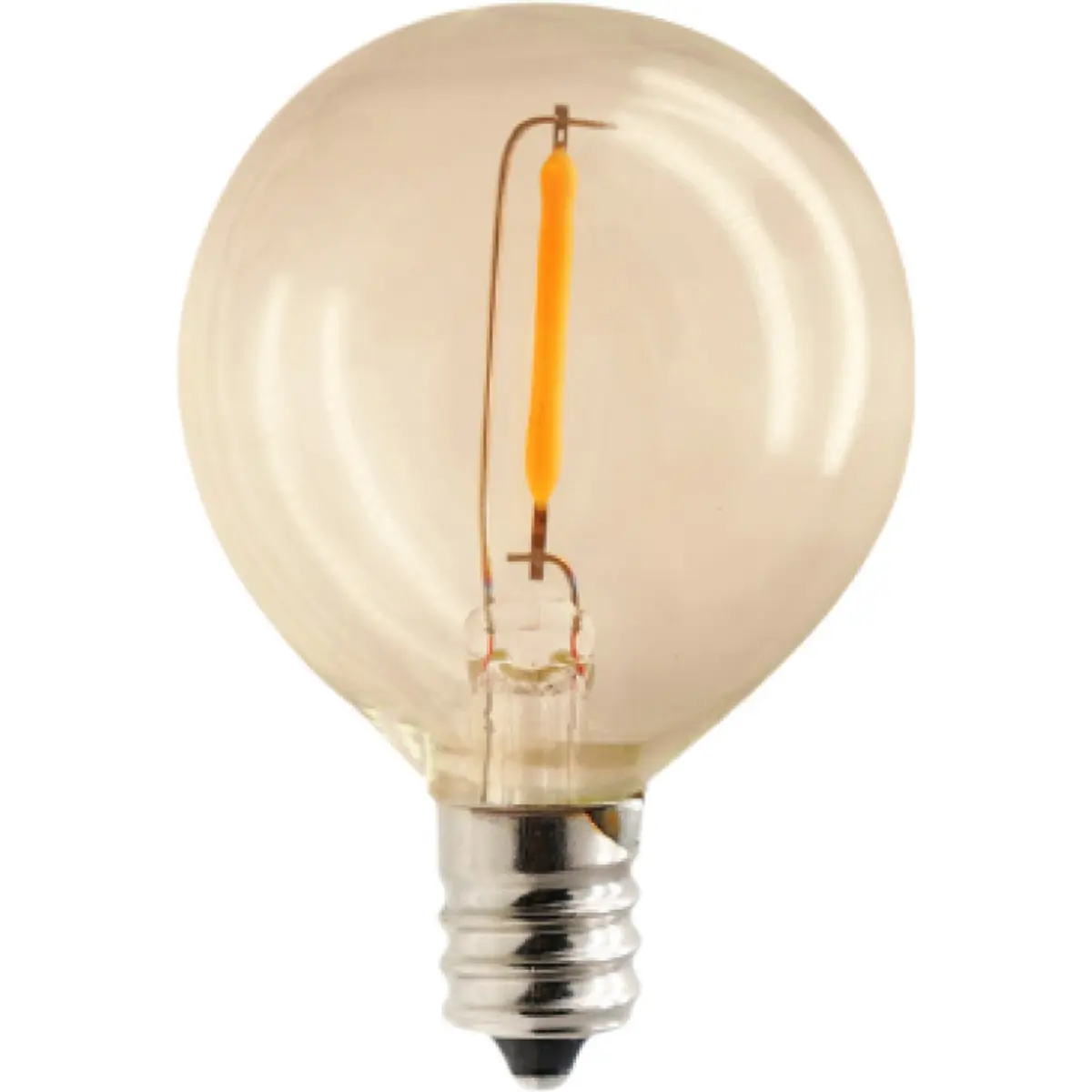 A lâmpada de filamento E12 G40 com uma tensão de entrada de 3 V é perfeita para uma grinaldas solares. A lâmpada emite uma luz agradável com um brilho de 30 lumens e uma cor de 2700K.