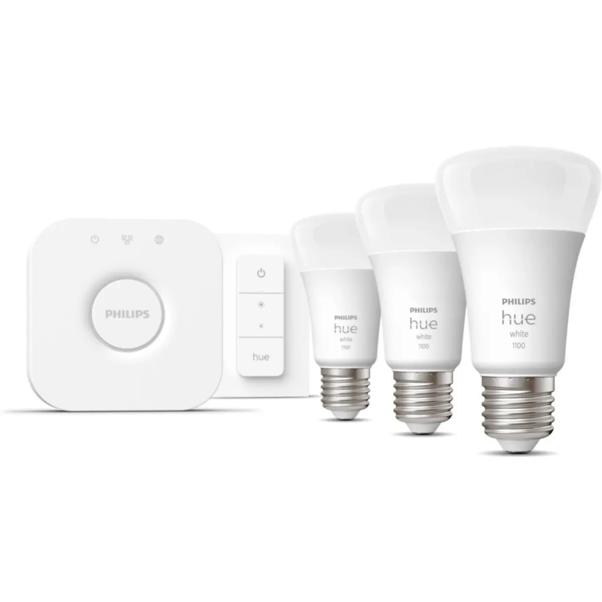 Kit inicial Hue White: 3 lâmpadas inteligentes E27 A60 1100 + Bridge + comando de regulação da intensidade da luz.