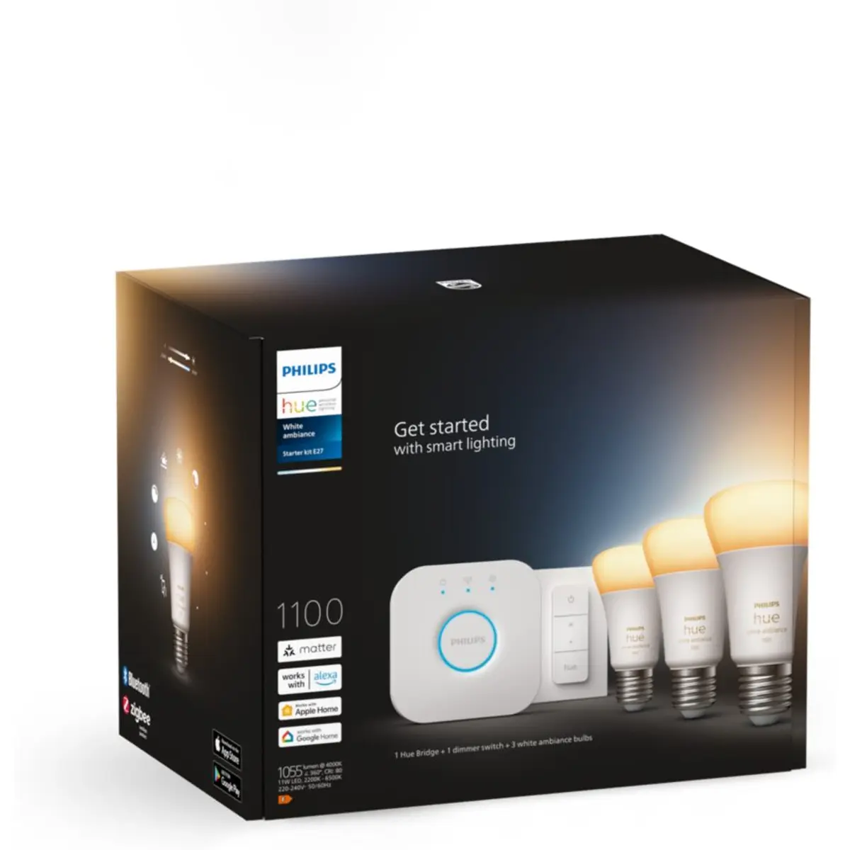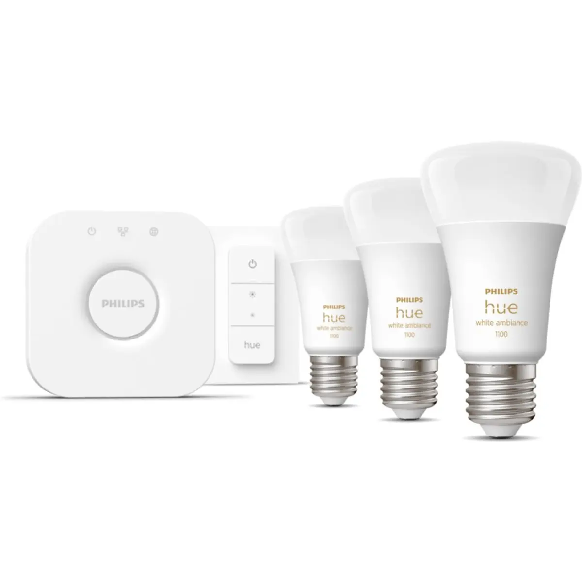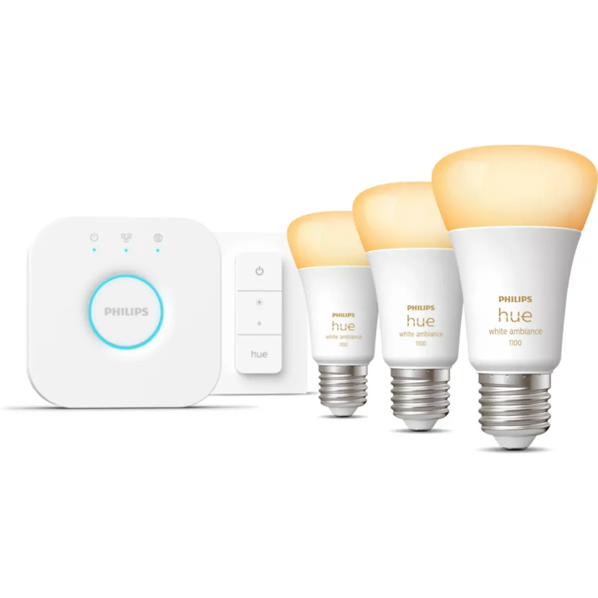 Kit inicial Hue White Ambiance: 3 lâmpadas inteligentes E27 A60 Hue White Ambiance 1100 + Bridge + comando de regulação da intensidade da luz.