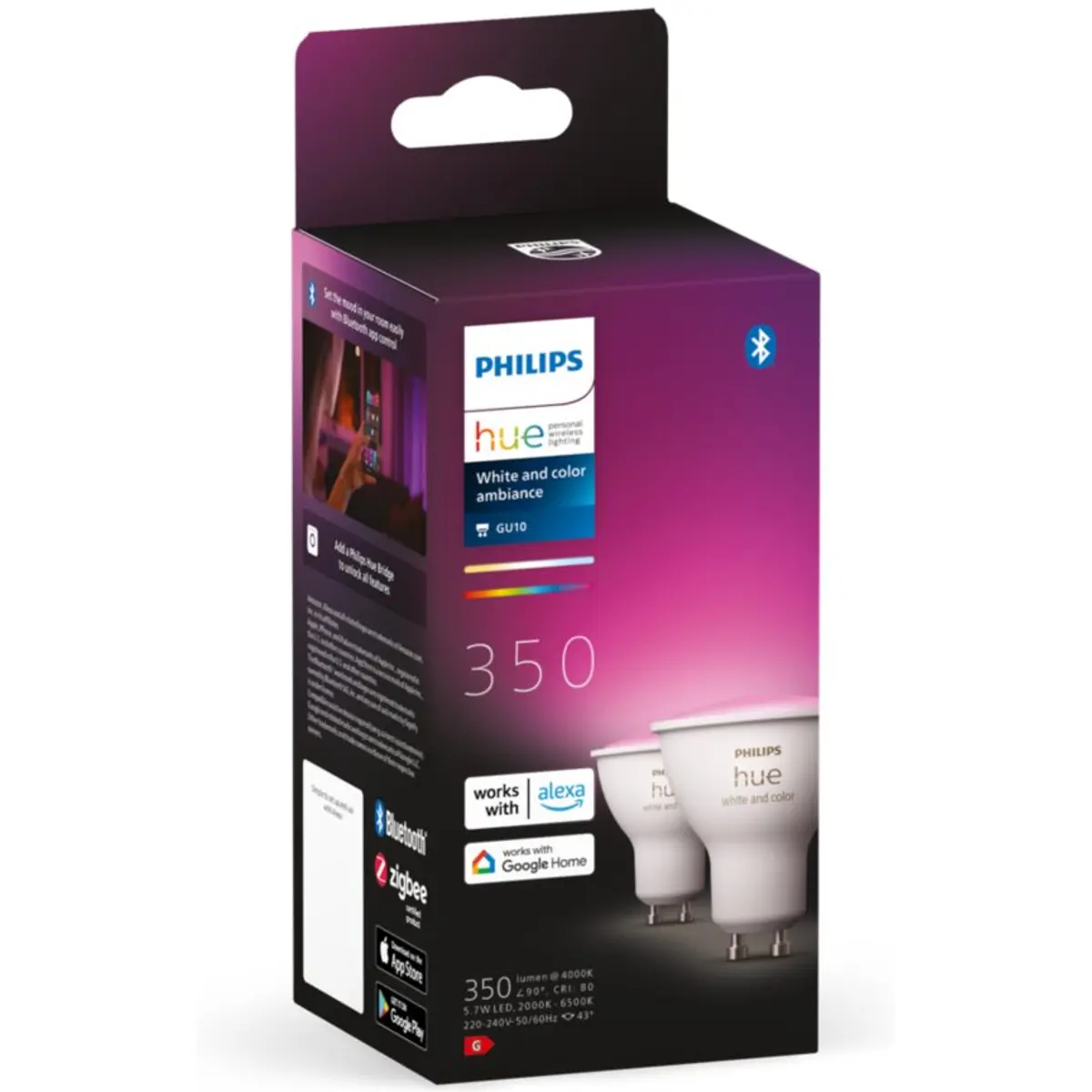 Graças a milhões de tonalidades de luz branca e colorida, estas lâmpadas LED inteligentes GU10 permitem-lhe definir o ambiente de forma instantânea em qualquer divisão da sua casa.