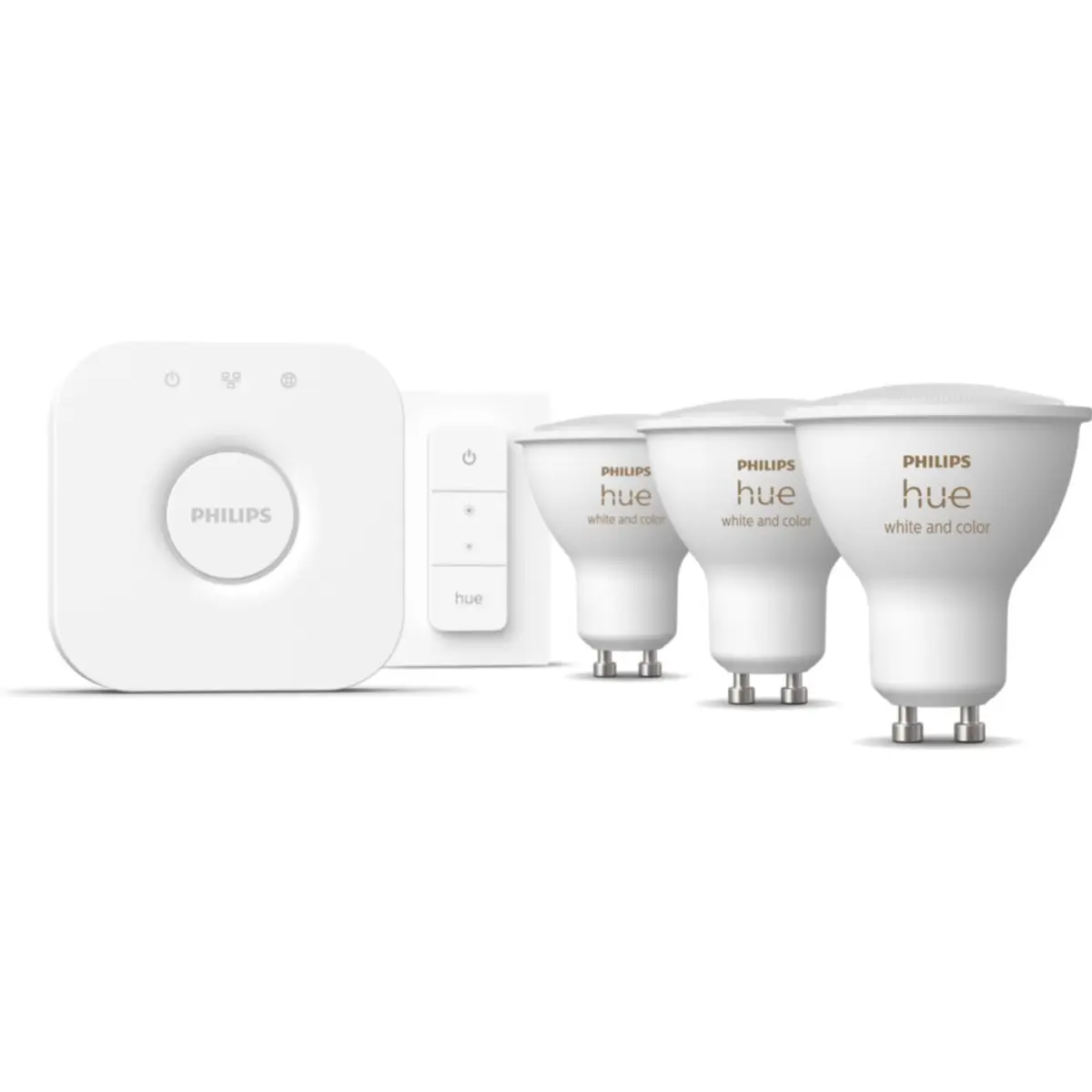 Kit inicial Hue White and color Ambiance GU10: 3 lâmpadas inteligentes GU10 + Bridge + comando de regulação da intensidade da luz.