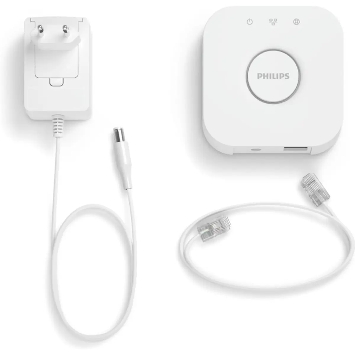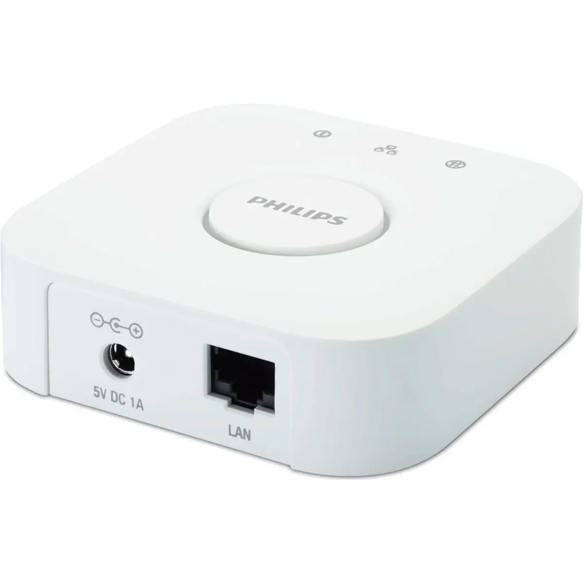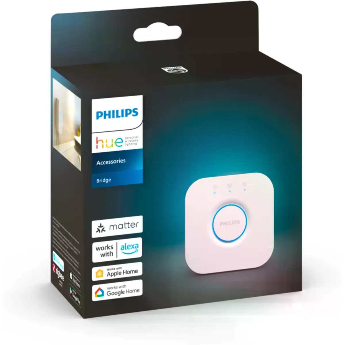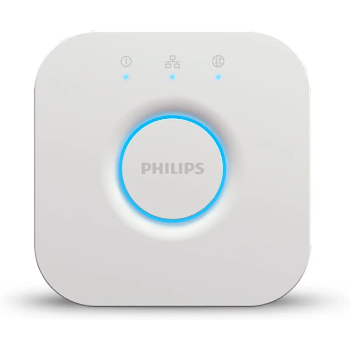 O cérebro do sistema de iluminação inteligente Philips Hue: a Hue Bridge permite-lhe conectar e controlar até 50 luzes e 10 acessórios. Basta ligá-la e usar a aplicação Hue para definir rotinas, temporizadores, efeitos de luz personalizados e muito mais.
