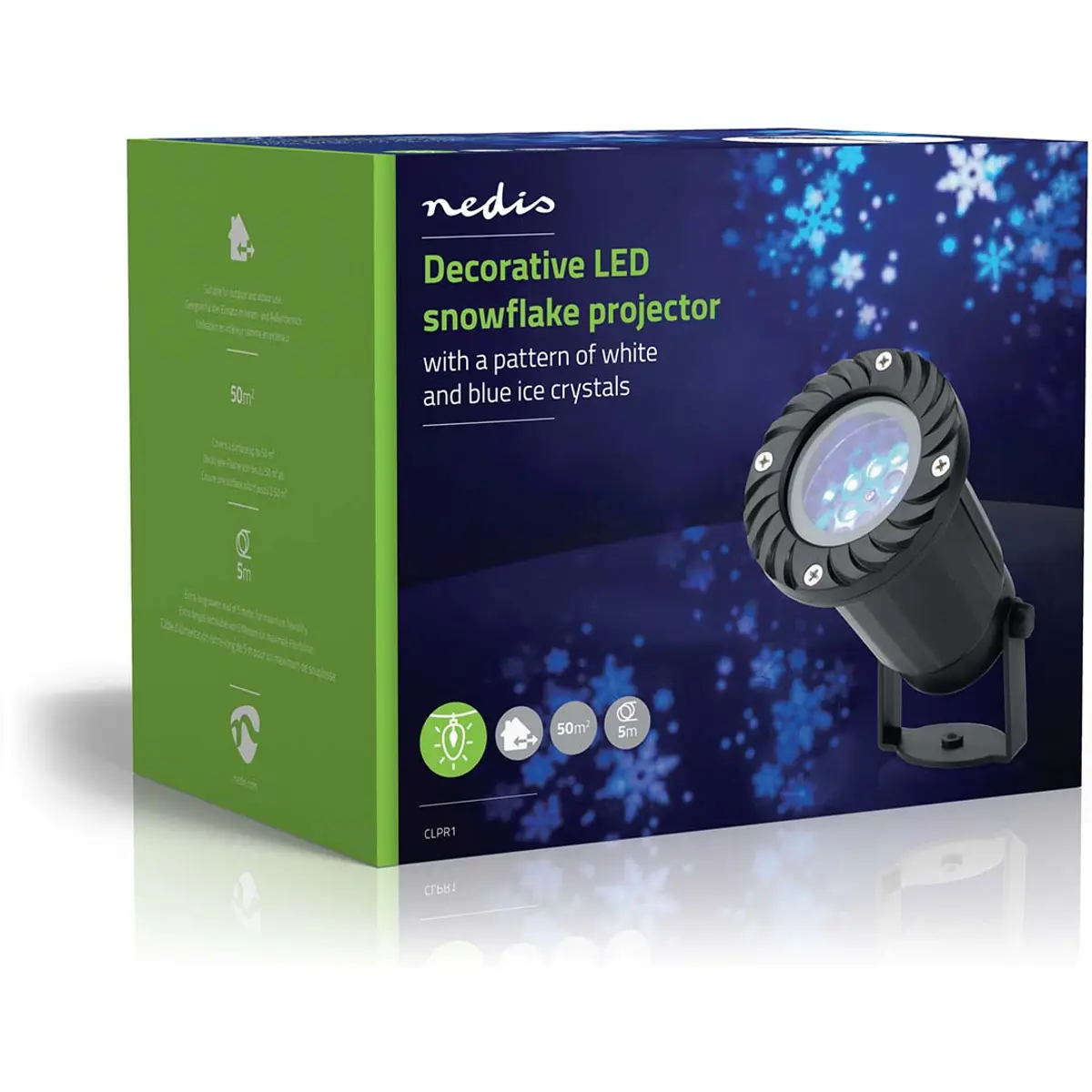 Projetor de flocos de neve LED da Nedis traz um padrão atmosférico em movimento de cristais de gelo brancos e azuis para a sua decoração sazonal. Basta colocar o projetor onde quiser, tanto ao ar livre como no interior. O cabo de alimentação extra longo de 5 metros oferece máxima flexibilidade, mesmo que não haja uma tomada próxima. É fácil de usar; basta ligar a ficha de alimentação a uma tomada, inserir a estaca de fixação ao solo e o projetor criará diretamente uma cena de inverno. Com uma área de cobertura de até 50 m², transforma qualquer fundo num tela.