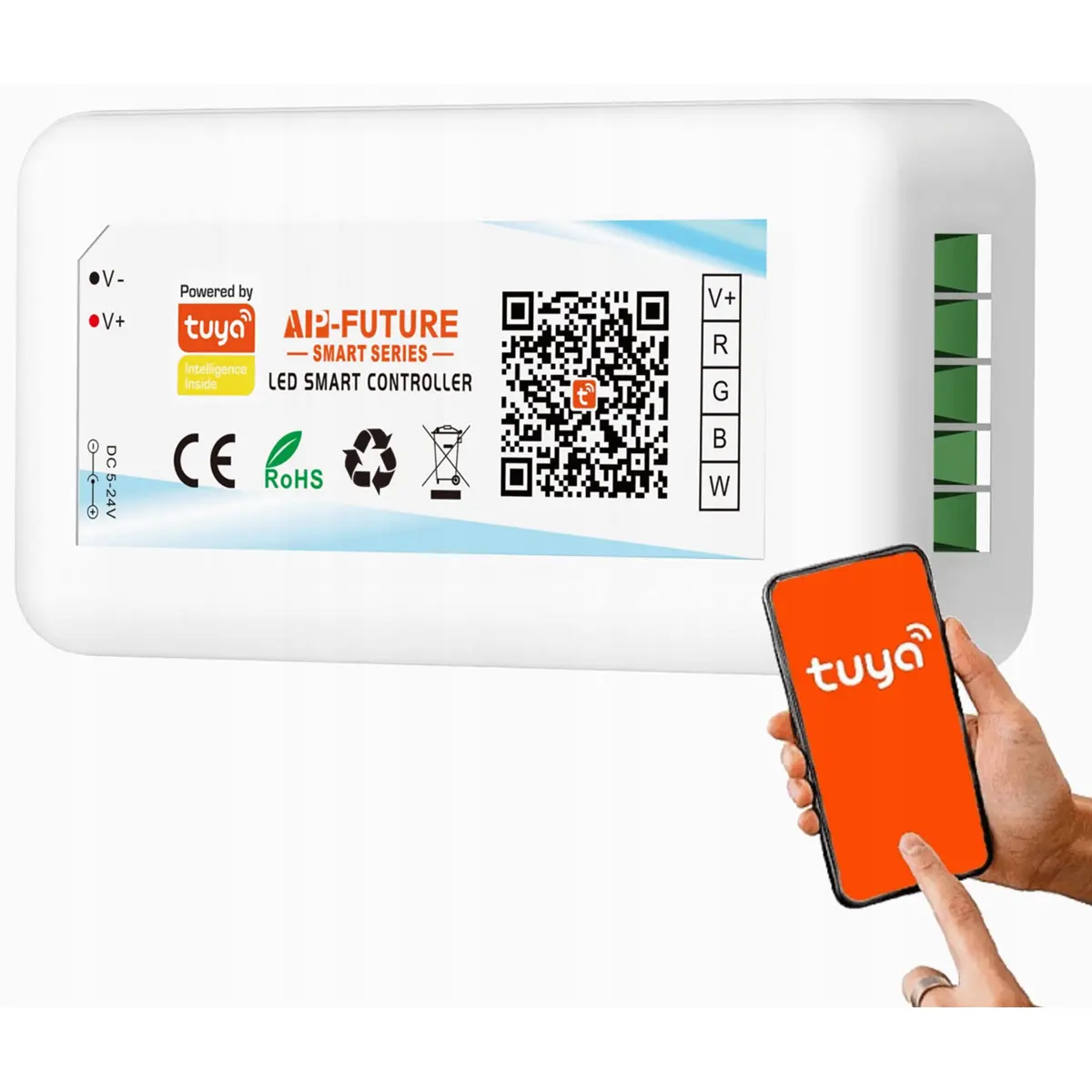 O controlador de fitas LED sem fios Tuya é uma solução inovadora para gerir a iluminação de fitas LED RGBW. A sincronização do controlador com a aplicação móvel garante a comodidade de utilização (sem controlo remoto). A instalação de uma aplicação para telemóvel dedicada (Android/iOS) permitirá controlar a iluminação com assistentes de voz como Alexa ou Google.