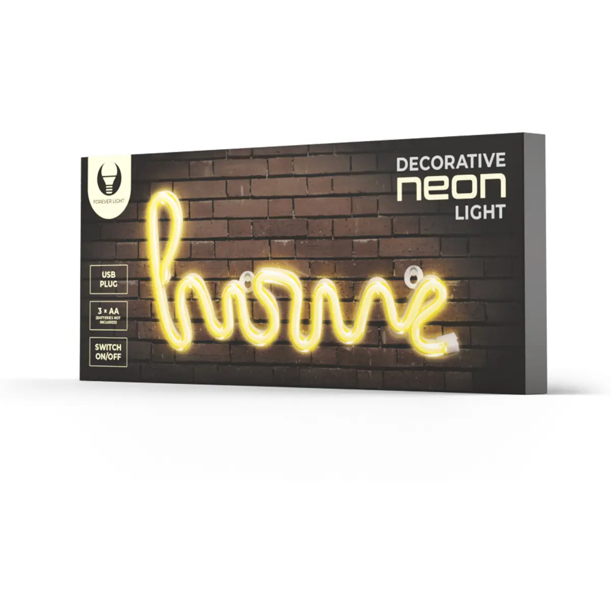 Graças à tecnologia LED, as luzes de Neon consomem quantidades relativamente baixas de eletricidade. O dispositivo é alimentado através da ficha USB ou 3 pilhas AA, e possui um interruptor ON/OFF localizado na caixa das pilhas.