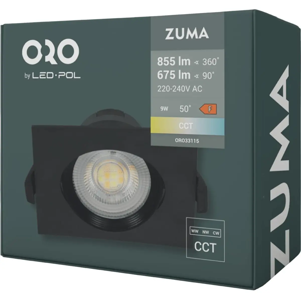 LED POL ORO-ZUMA-LED-S-9W-CCT-B - Downlight preto LED orientável quadrado 230VAC 9W 675lm 3000/4500/6500K 110x110x42mm