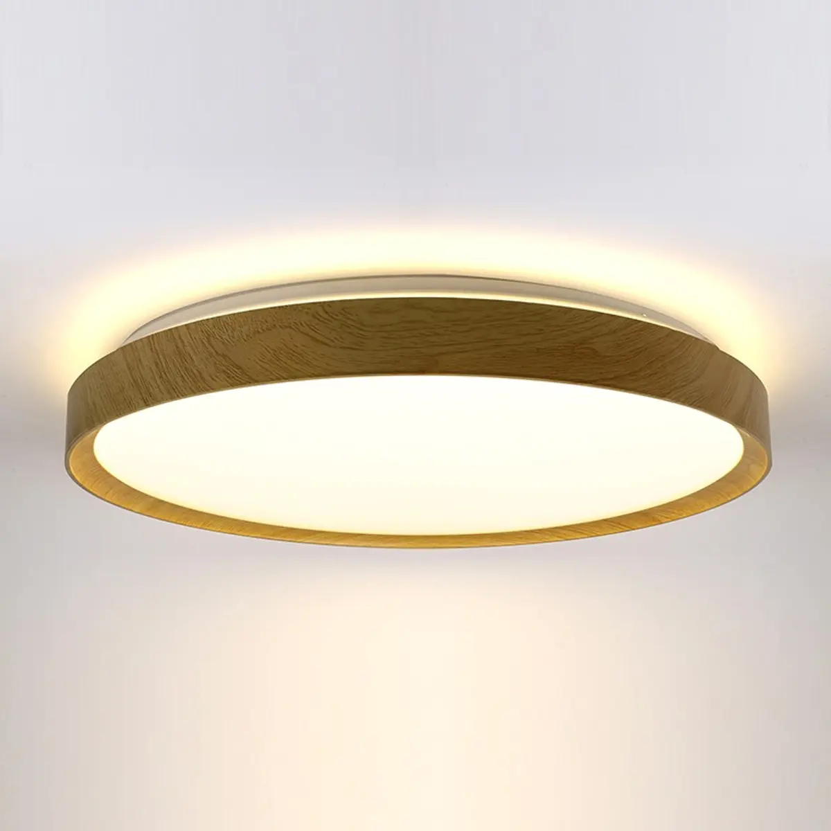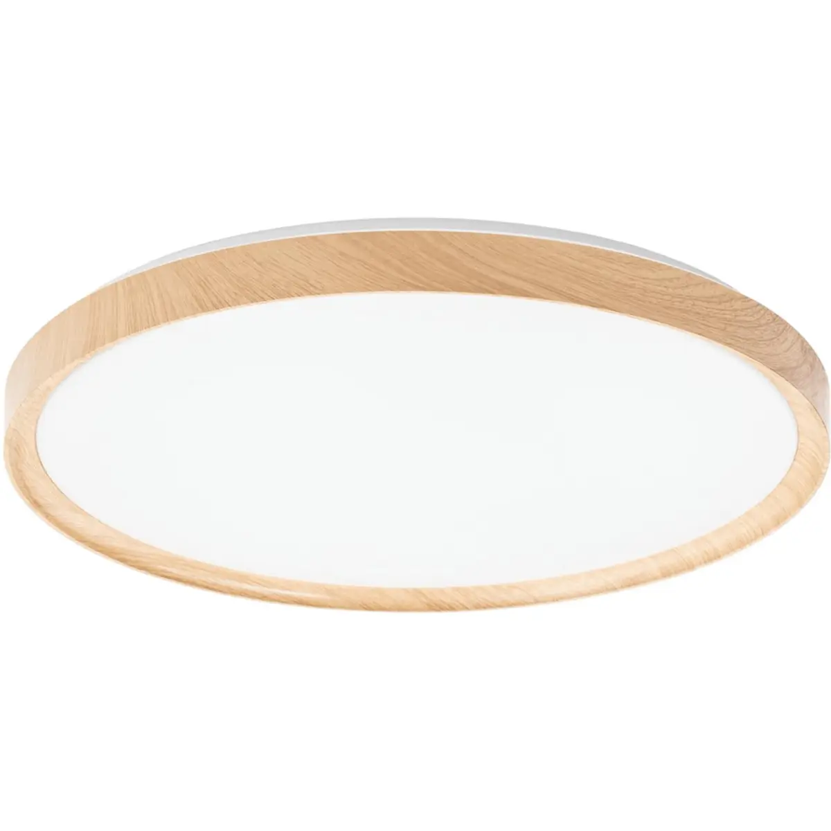 Plafon LED para instalação em interior com alimentação 220-240 V AC, potência 24 W e 1320 lúmenes, oferecendo iluminação de branco neutro a 4000 K. Possui ângulo de abertura de 115°, índice de proteção IP20, dimensões Ø340 x 70 mm e peso de 580 g. A cor madeira confere um acabamento natural, adequado para ambientes interiores.