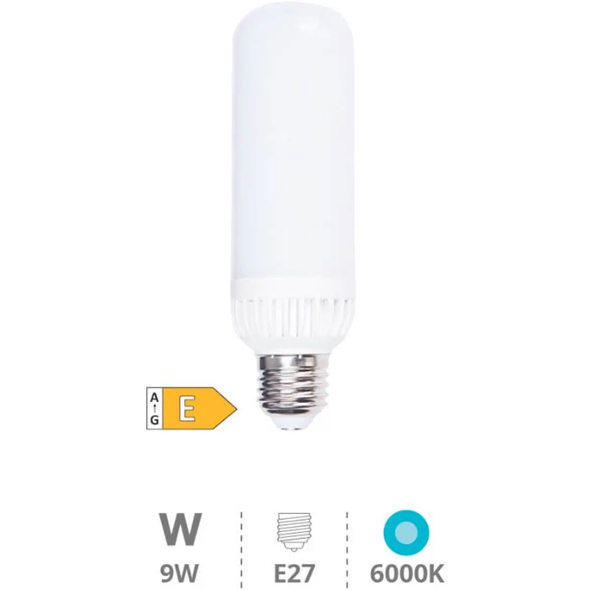 Esta lâmpada LED tipo cornlight com casquilho E27 oferece iluminação eficiente a 230V, consumindo 9W para entregar 1000lm e uma temperatura de cor de 6000K, branco frio. Possui ângulo de abertura de 360°, IP20, início instantâneo e CRI ≥0.80. A vida útil é de 25.000 horas, com até 100.000 ciclos de comutação. Ideal para iluminação interior, comércio e habitações, com dimensões Ø45x147mm.