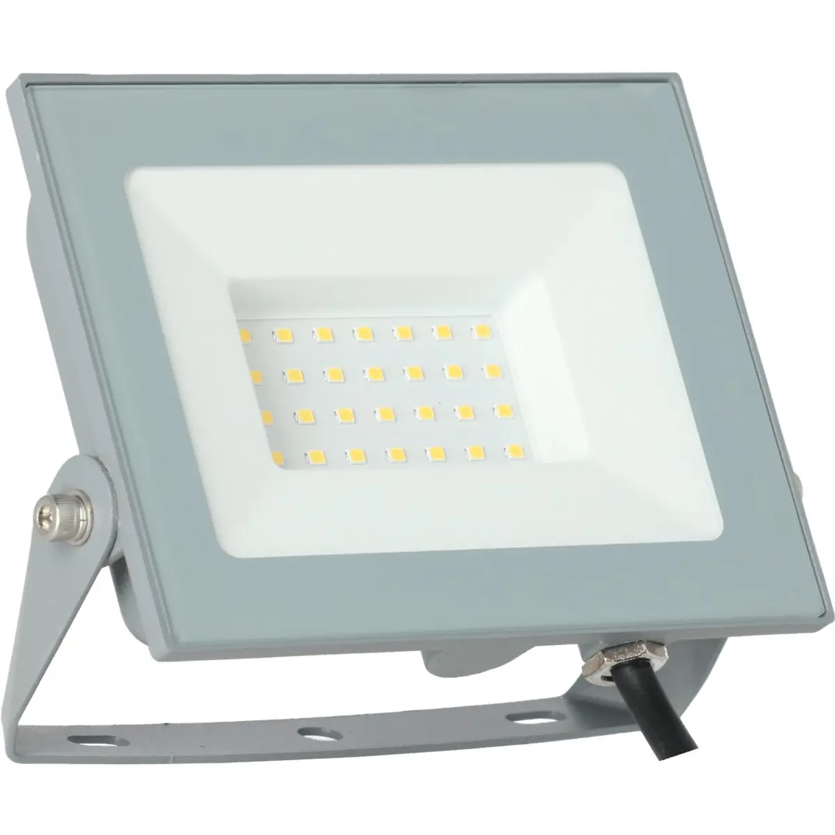 Projetor LED Slim alimentado por 220-240V AC, 50 Hz, com 30 W de potência e temperatura de cor de 4000K (branco neutro). Oferece fluxos luminosos de 2640 lm a 120° e 3000 lm a 360°, com abertura de 110°. A eficiência é de 90 lm/W, com intensidade máxima de 1077 cd. Apresenta grau de proteção IP65, CRI > 80 Ra e PF > 0,95. Operando entre -20 e 40ºC, não dimável, peso de 330 g e dimensões de 164 x 139 x 29 mm. Inclui cabo, sem ficha.