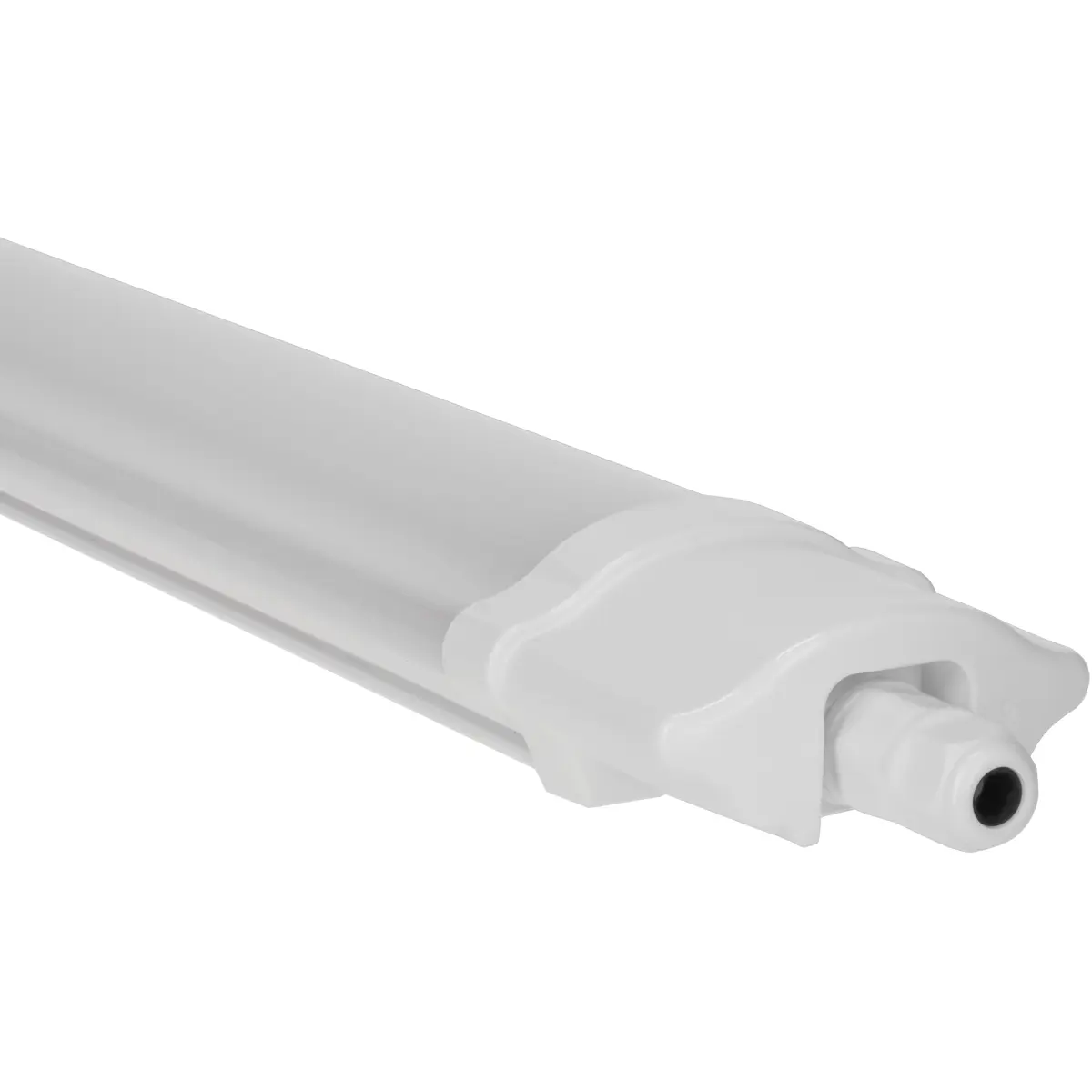 Armadura LED estanque de 48W para uso externo, com 7200 lúmens, emissão de 360° e ângulo de emissão de 115°, temperatura de cor 4000K (branco neutro) e eficiência de 150lm/W. Alimentação 230V, proteção IP65, dimensões 1557x79x42mm e peso 490 g. Ideal para fachadas, perímetros e zonas industriais, oferecendo iluminação uniforme, fiabilidade, resistência a condições climáticas adversas e eficiência energética.