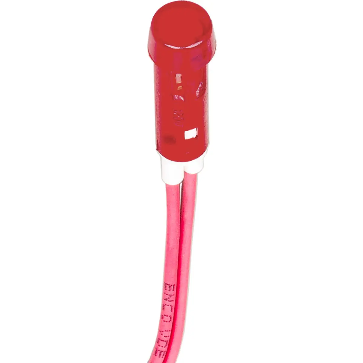 Indicador com lâmpada de néon operando a 230 V AC, cabeça de Ø10.7x6 mm e furação Ø9 mm, com fios de +-20 cm na cor vermelha. Ideal para sinalização visual em painéis elétricos, quadros de comandos e instrumentos, proporcionando indicação clara do estado do equipamento. Montagem simples em painel, baixo consumo e boa visibilidade, útil em ambientes industriais ou residenciais.