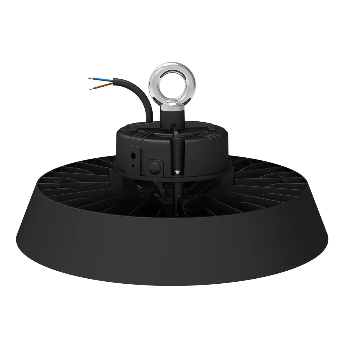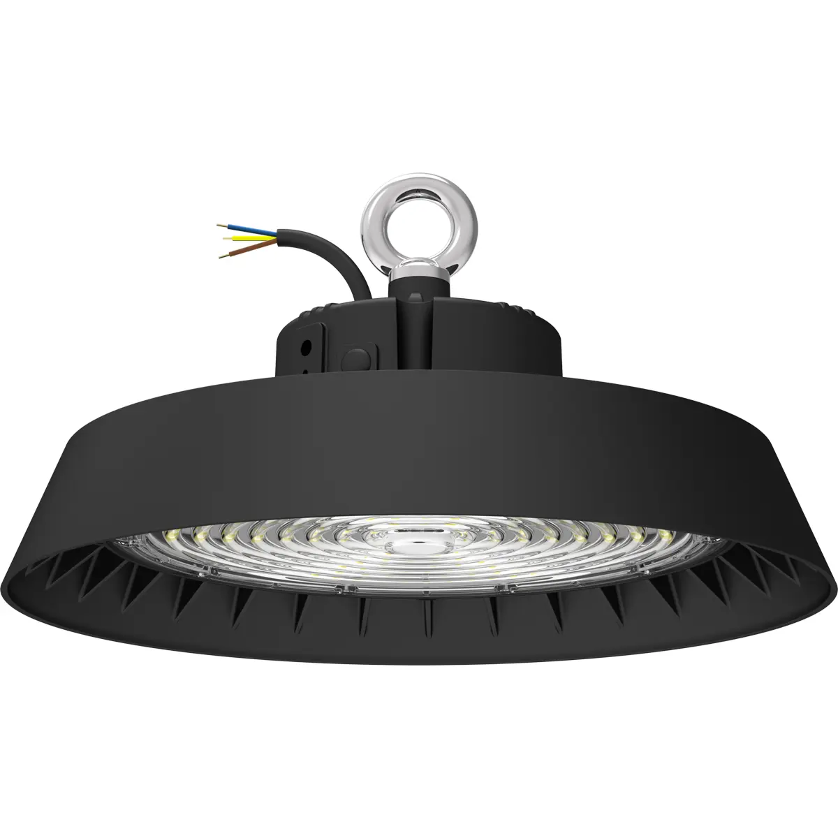 Luminária LED de alto desempenho para áreas industriais com potência ajustável entre 100W, 150W e 200W e temperaturas de cor CCT 4000K, 5000K e 5700K, ideal para armazéns, fábricas e espaços logísticos. Oferece feixe de 120°, CRI > 80 e fluxo até 34.000 lúmens. Alimentação AC 120-277V 50/60Hz. Construída em alumínio com lente integrada para durabilidade e eficiência energética. Dimensões Ø350 x 133 mm.
