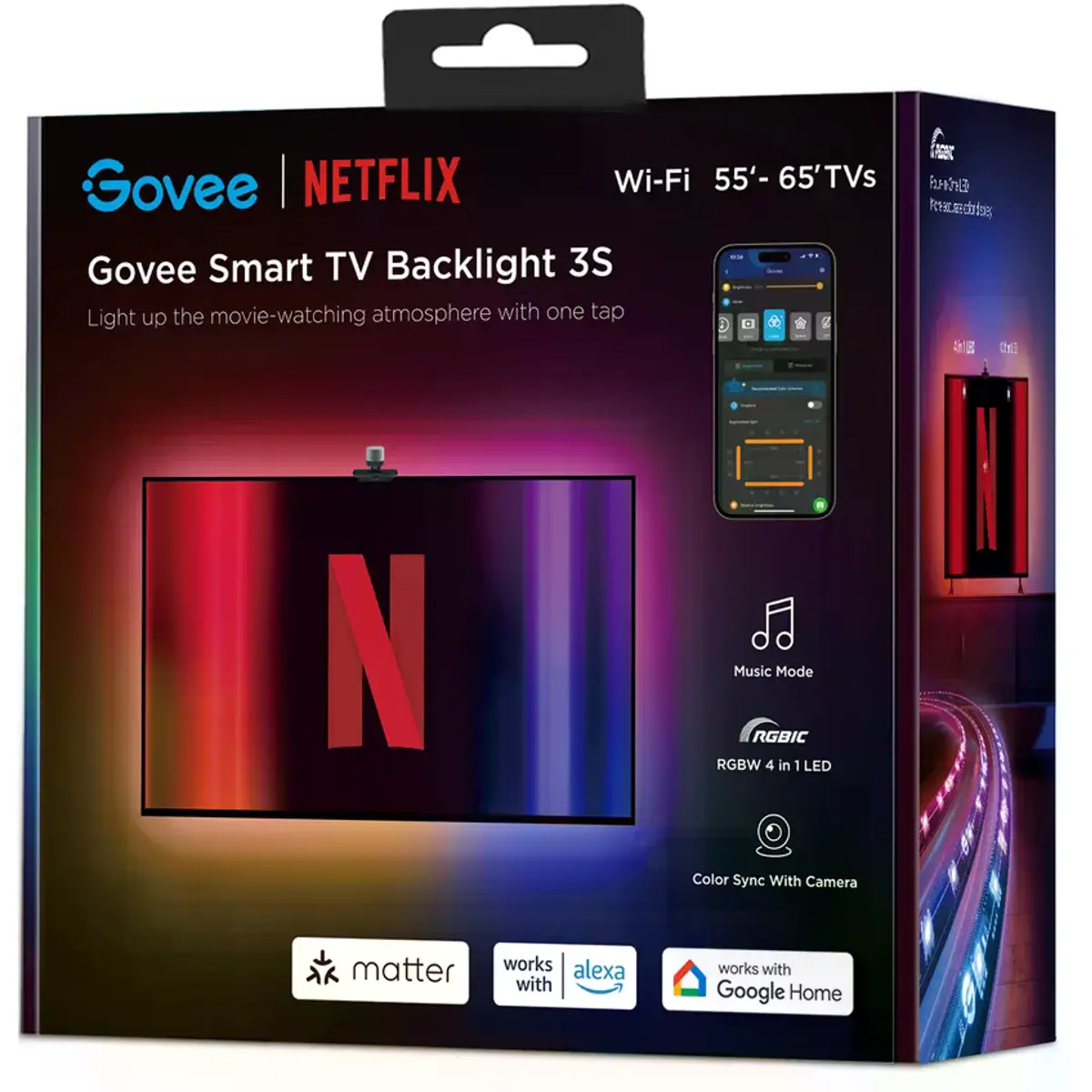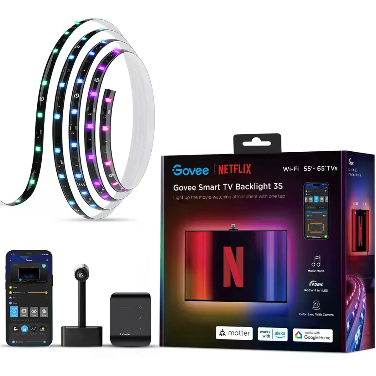 O "Govee TV Backlight 3S (55~65 inch) NETFLIX CO-BRANDING" é uma fita de LED inteligente que ilumina as bordas da TV com cores vibrantes, sincronizadas em tempo real com o conteúdo, proporcionando uma experiência de visualização imersiva. Esta versão, desenvolvida em parceria com a Netflix, é para TVs de 55 a 65 polegadas, é facilmente controlada com o aplicativo Govee Home e suporta comandos de voz (via Amazon Alexa e Google Assistant).