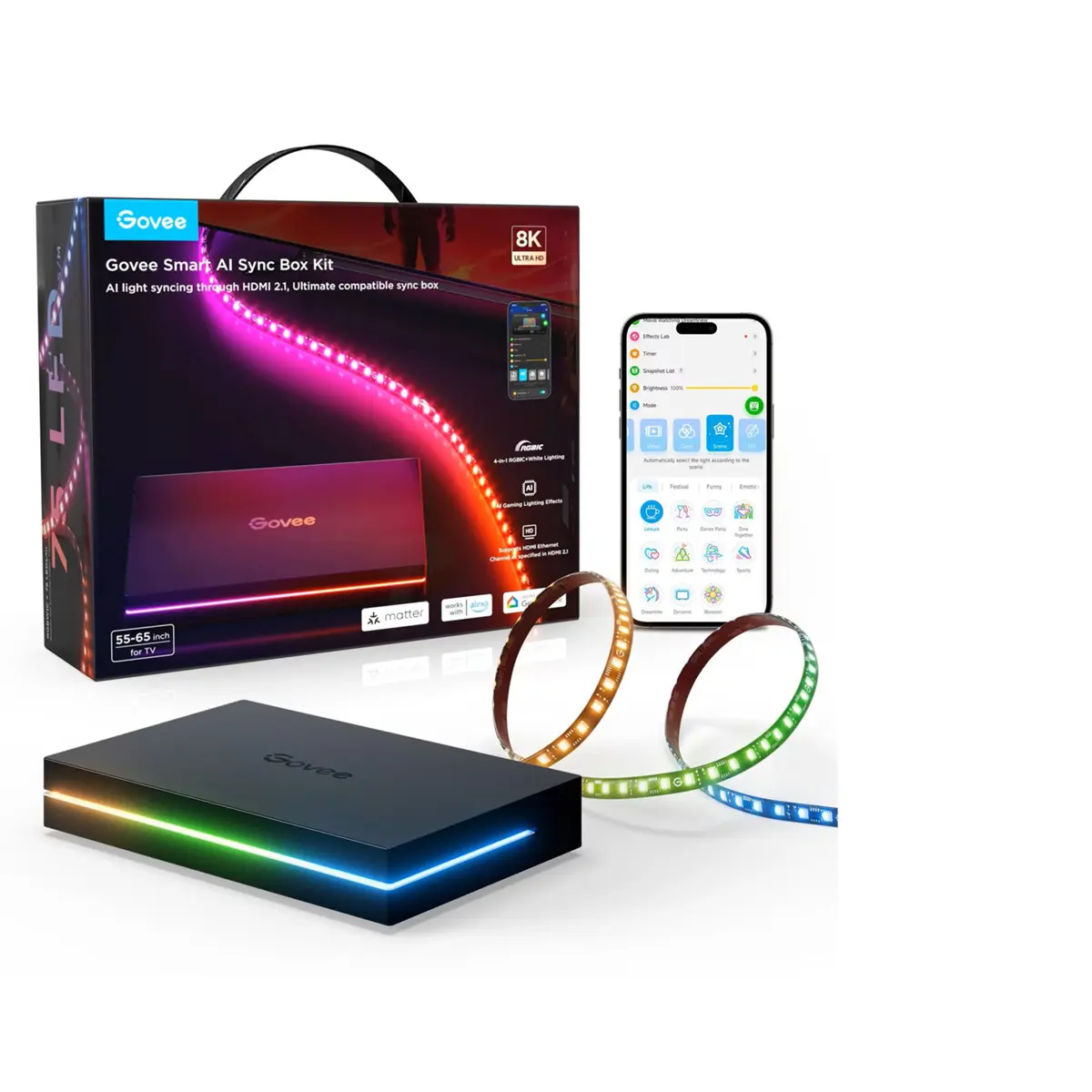 A "Govee AI Gaming & TV Sync Box 2" foi projetada para sincronizar a iluminação da sua experiência de jogo e entretenimento com o que está acontecendo no ecrã. Este produto inclui uma fita de LEDs para ecrãs de 55 a 65 polegadas e desempenha um papel crucial na criação de uma atmosfera imersiva, com efeitos de iluminação movidos por IA que respondem à ação ou ao conteúdo no ecrã.