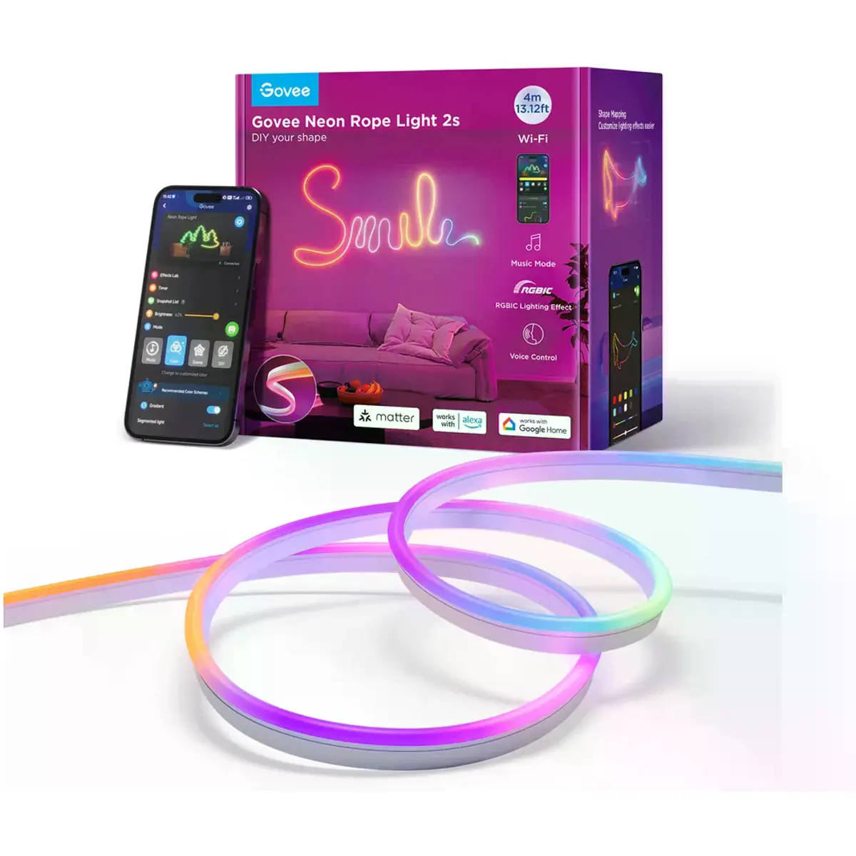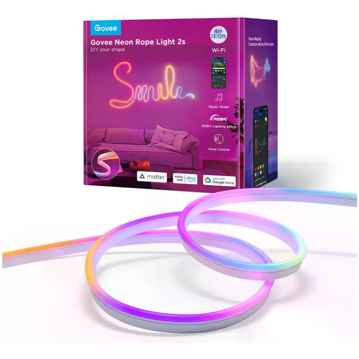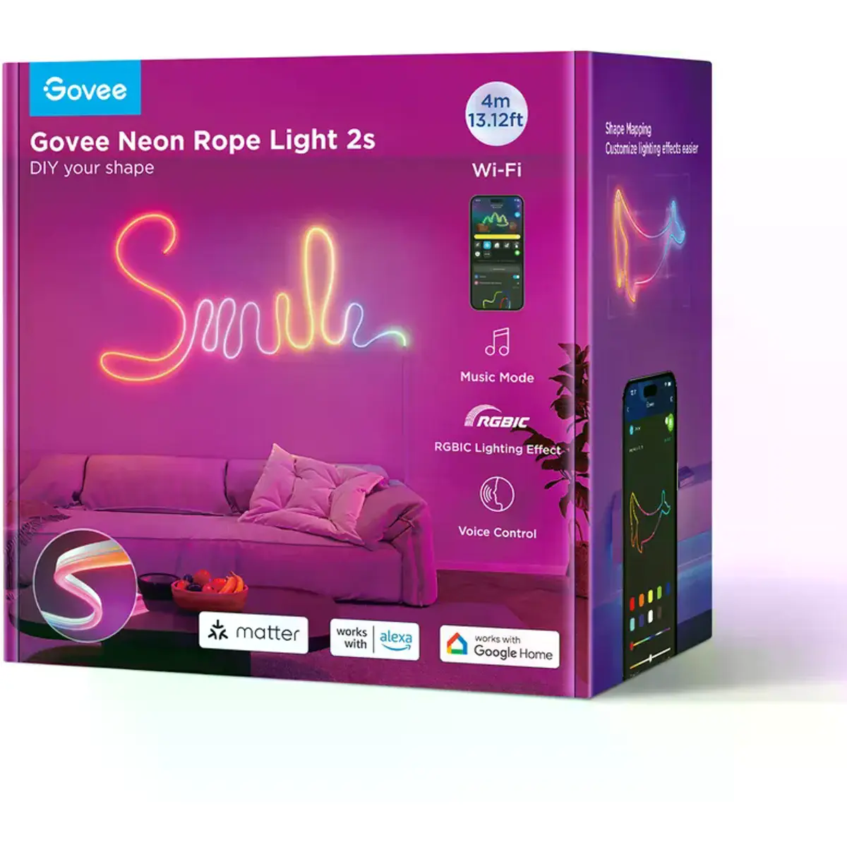 A Govee Neon Rope Light 2 é uma fita LED flexível e personalizável de 4 metros, com controle por voz e aplicativo, efeitos de luz dinâmicos RGBIC e resistência à água IP67, ideal para criar ambientes envolventes em interiores e exteriores.