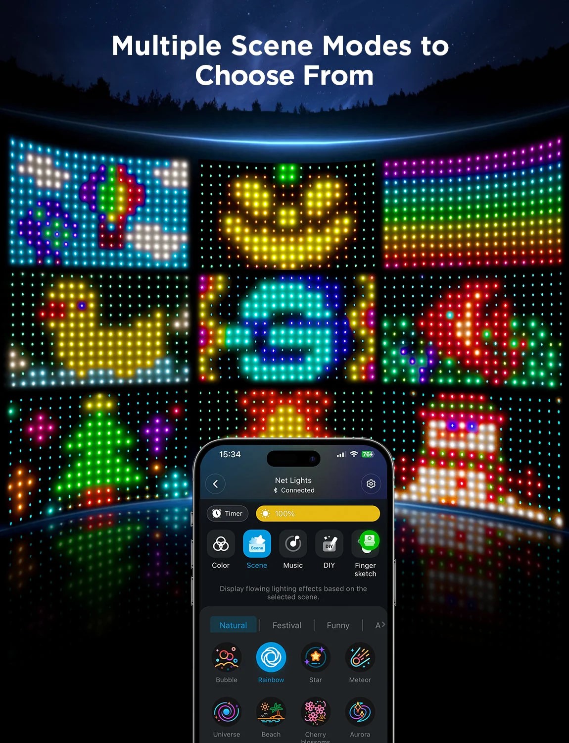 ◾ Modo DIY Criativo: Carregue imagens e GIFs para uma decoração de iluminação divertida e animada. Os LEDs na rede oferecem uma contagem de pixels elevada e efeito de renderização superior.