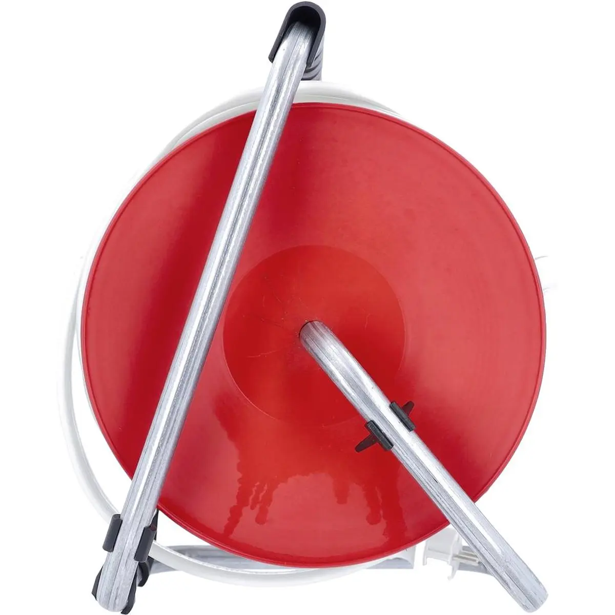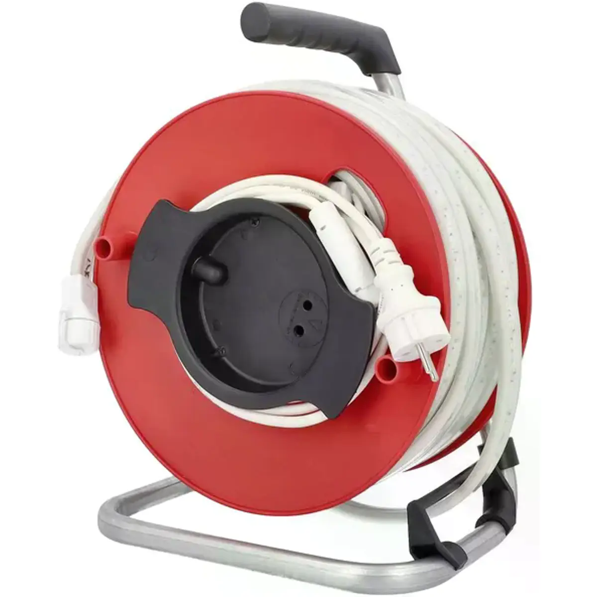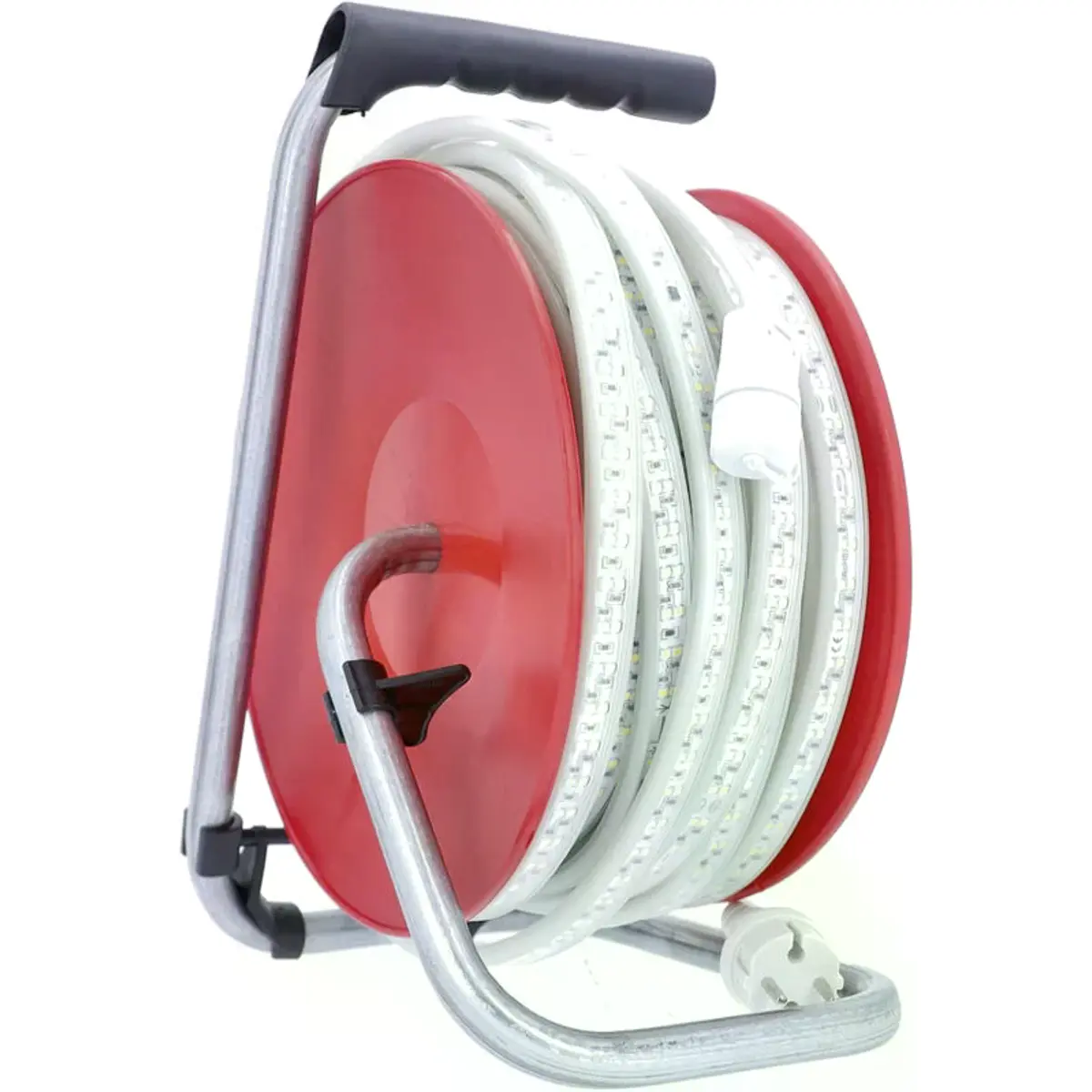 Fita de LED de 15m em tambor Ø230 mm com suporte de cabos, base galvanizada, pega moldada e travão de segurança.