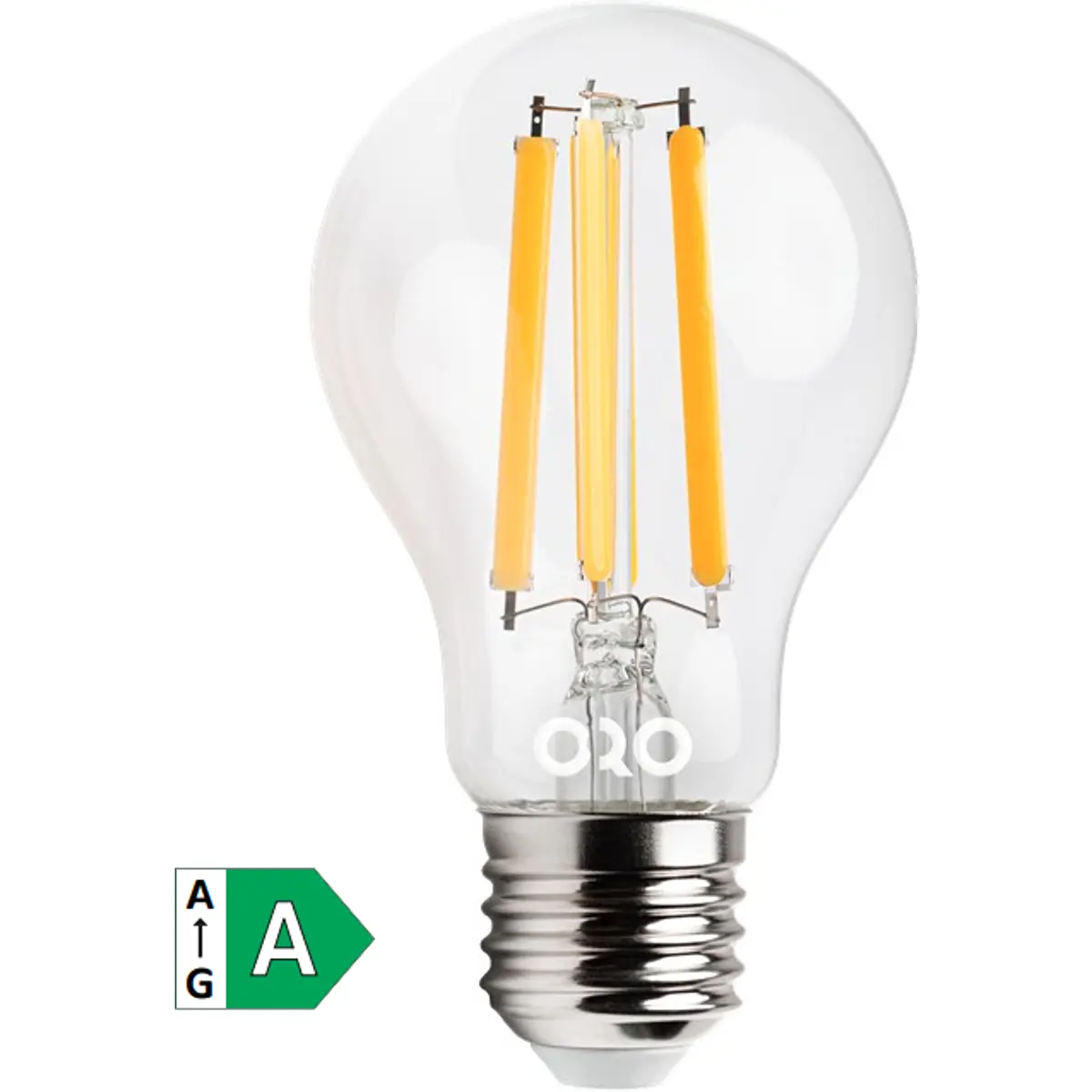 Esta lâmpada LED tipo filamento, com base E27 e formato A60, funciona a 230V com 4W de potência, emitindo 840 lm e 210 lm/W, com temperatura de cor de 3000K (luz branca quente). Possui ângulo de feixe de 320° e fator de potência 0,5, oferecendo iluminação ampla para espaços interiores, mantendo a classe energética A. Medidas de Ø60 x 108 mm. Design de filamento que remete a lâmpadas tradicionais, aliando eficiência moderna e estética clássica.