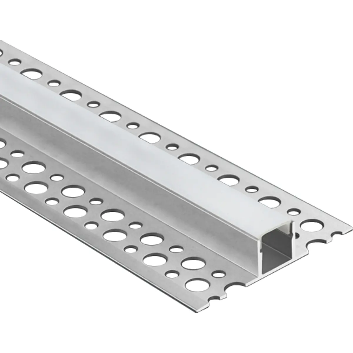Perfil de alumínio para encaixar em gesso cartonado com difusor para fita LED. Possui secção de 55x14 mm e comprimento de 2 metros, adequado para instalação em drywall. Oferece acabamento discreto e resistência, com difusão uniforme da luz ao longo da fita LED. Ideal para iluminar linhas, contornos e áreas interiores com iluminação indireta, preservando o estilo moderno dos interiores em gesso cartonado. Cor: alumínio.