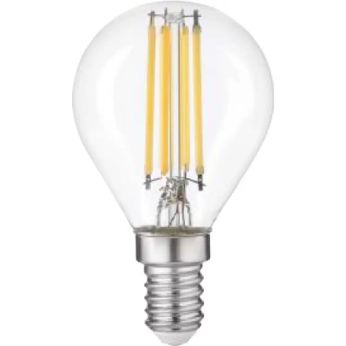 Lâmpada LED de filamento para soquete E14, com 6 W de potência, substitui 60 W de incandescente, produzindo 800 lm em 3000 K (branco quente). Funciona entre 220-240 V, com ângulo de 320°, CRI ≥ 80 e PF > 0,5. Não é dimável, classificada na classe energética E, opera de -20 °C a 40 °C, com cúpula de vidro, peso 14 g e dimensões Ø45 x 78 mm.