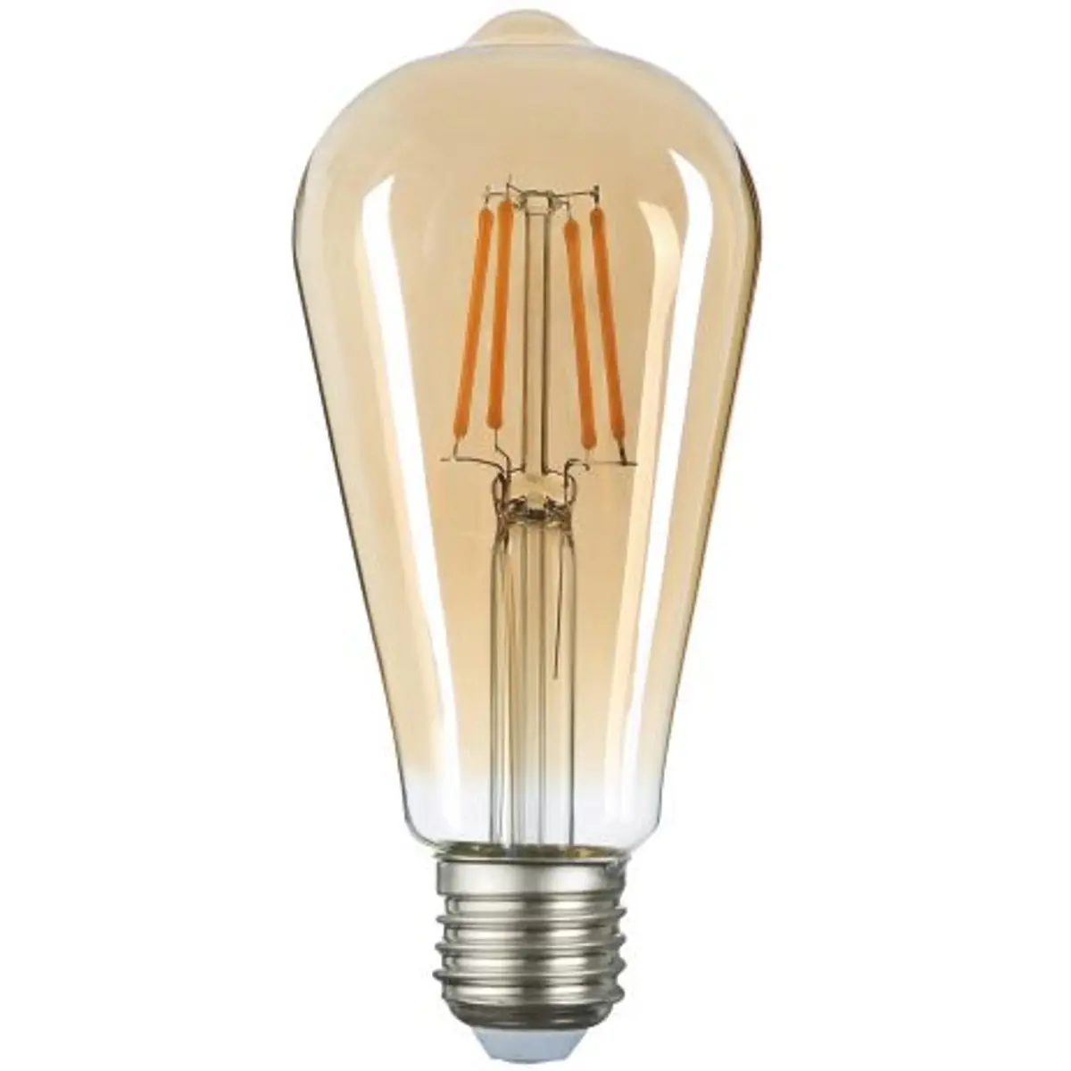 Lâmpada LED de filamento com base E27 ST64, 6W, 2000K (branco âmbar), 500lm, abertura de 320°, não dimável, CRI ≥ 80Ra e PF > 0,5, classe energética G. Opera entre 220-240 VAC, -20 a 40 °C, durabilidade nominal de 15000h. Dimensões Ø64x146 mm, em vidro, para substituir lâmpadas incandescentes de 42W.