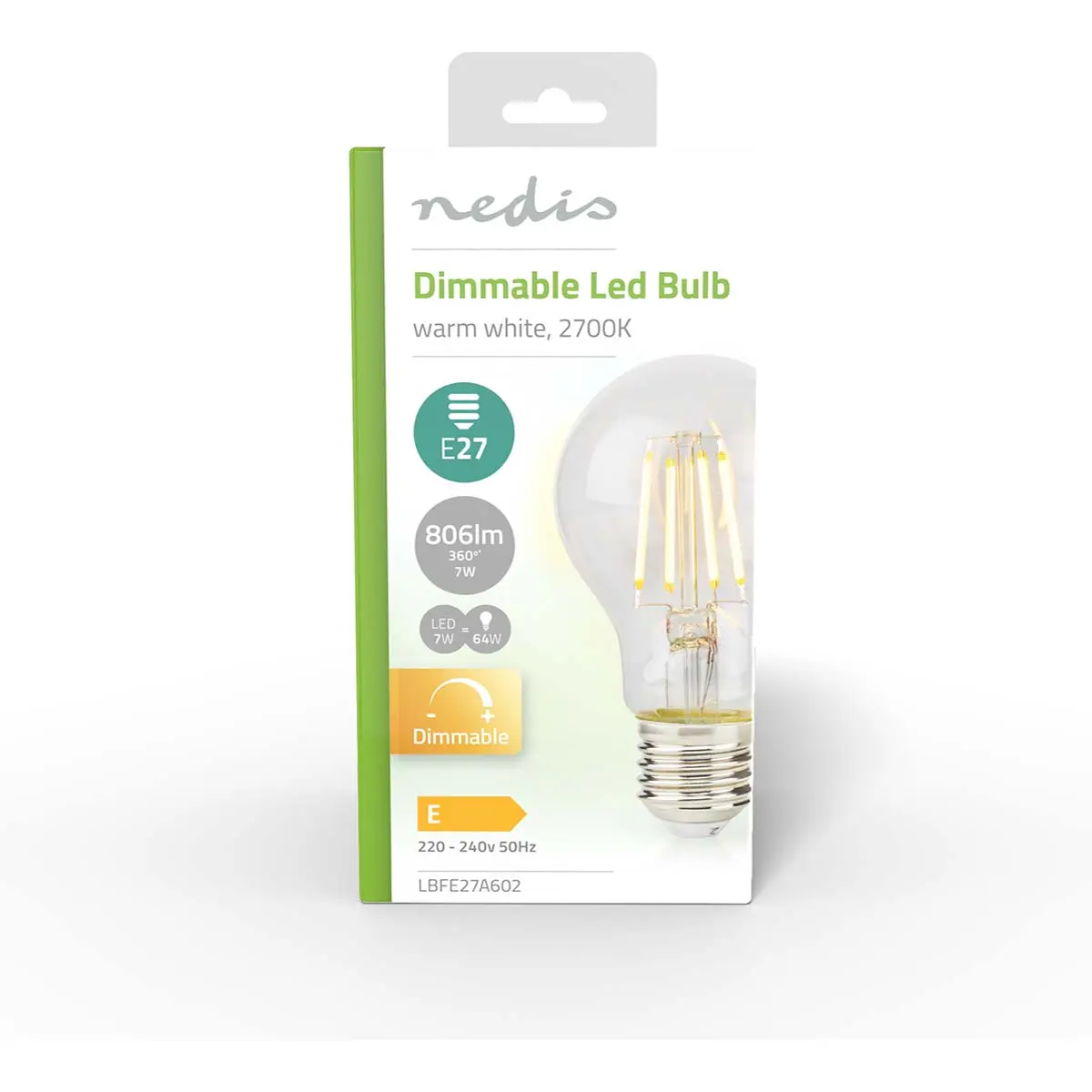 Esta lâmpada LED em formato A60 com base E27 para uso interior oferece iluminação branco quente de 2700 K. Com 7 W de potência e fluxo luminoso de 806 lm, funciona a 220-240 V AC, 50/60 Hz. O ângulo de feixe é de 320°, com tempo de aquecimento inferior a 1 s para 60% de luz e arranque inferior a 0,5 s. Regula-se, tem diâmetro de 60 mm, peso 27 g, Ra 80, SDCM ≤ 6, vida útil 15.000 h, classe energética E, consumo 7 kWh/1000 h. Embalagem Euro Lock.