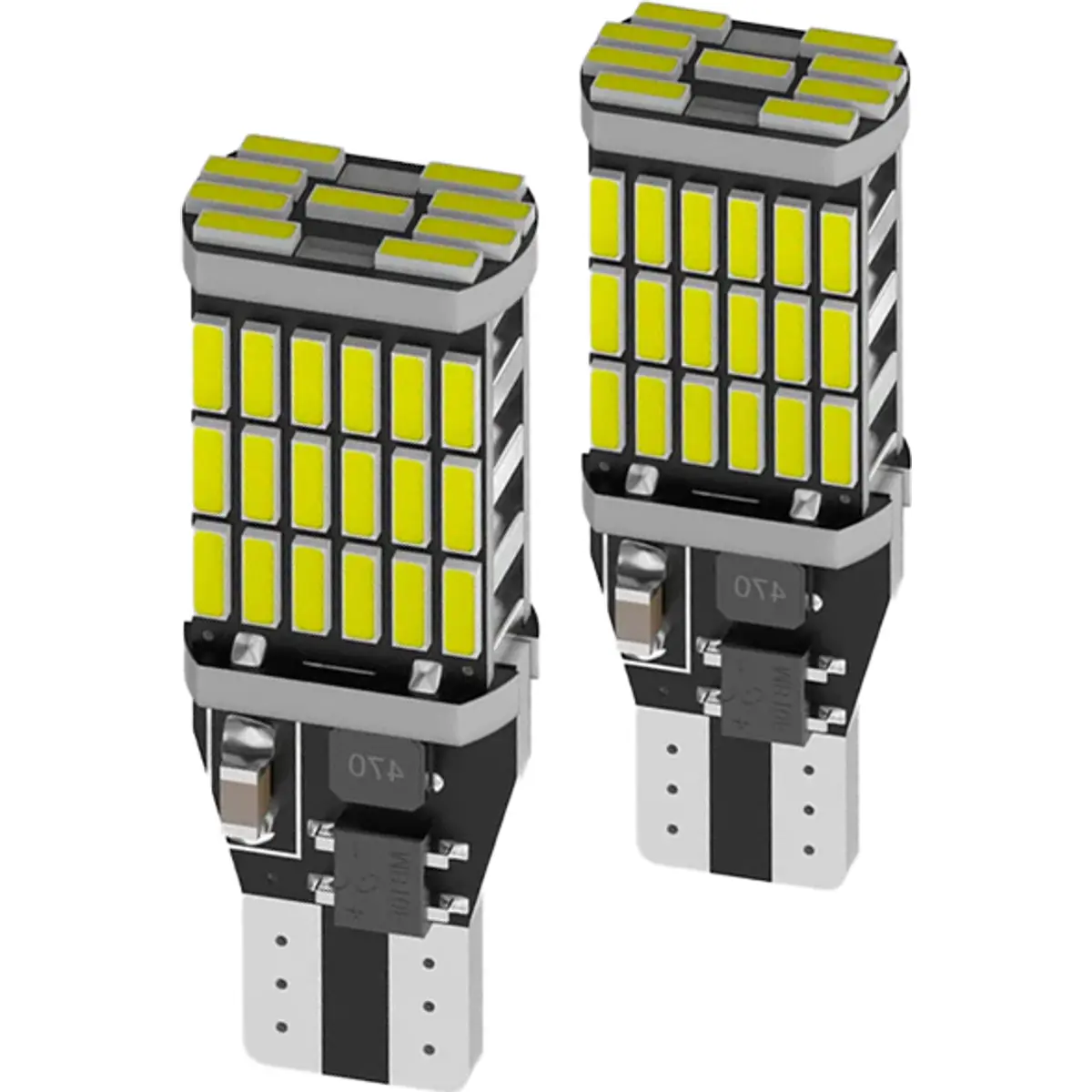 Conjunto de lâmpadas LED T15 W16W com base T15 e tecnologia LED CSP, operando entre 12 e 80 V. Cada unidade emite 600 lm com temperatura de cor de 6000 K para luz branca fria. Compatível com CAN Bus, ideal para substituição de sistemas com rede CAN, incluindo 2 unidades por embalagem. Oferece 10 W de potência por lâmpada, diâmetro compacto com 40 mm de comprimento e 14 mm de largura, adequado para aplicações automotivas.