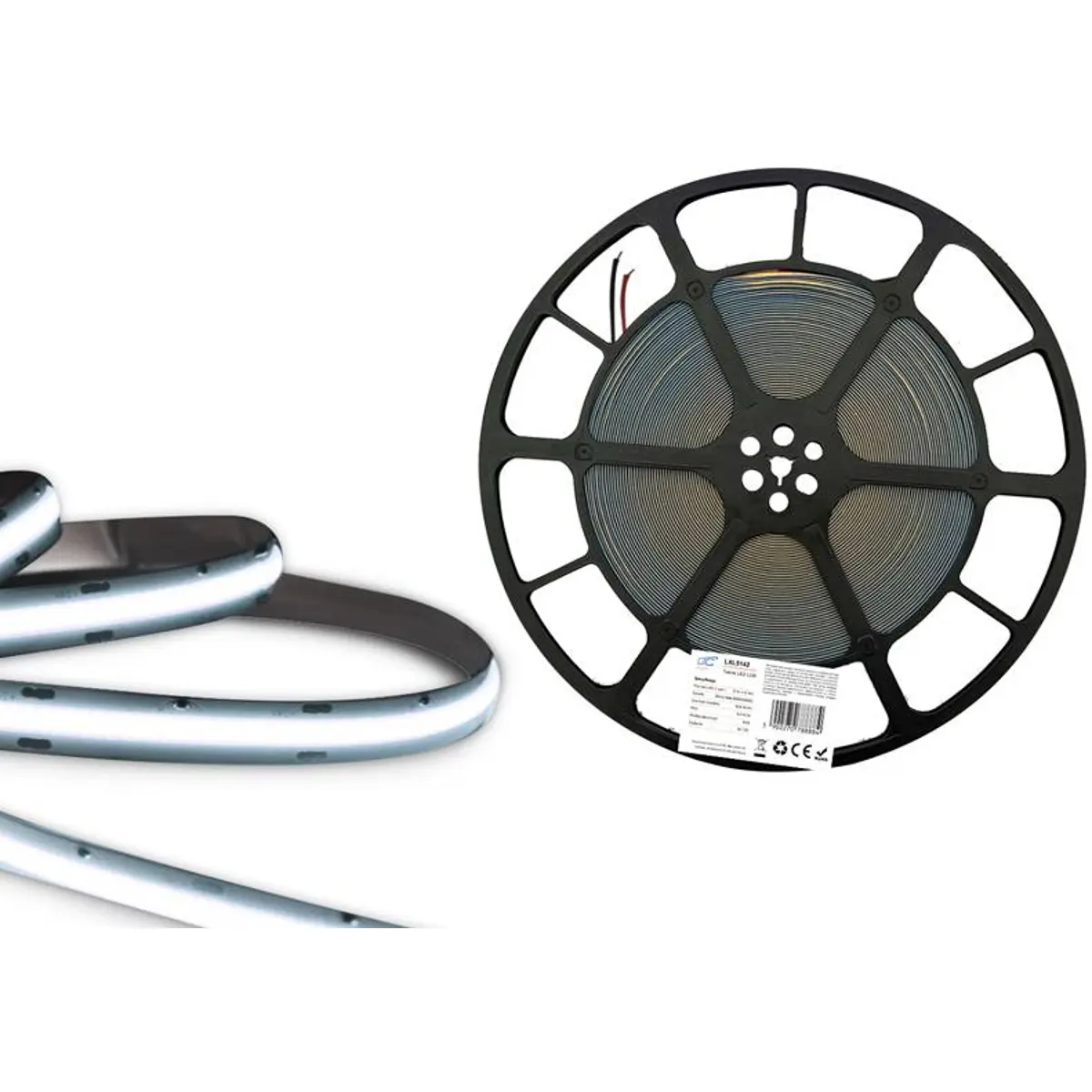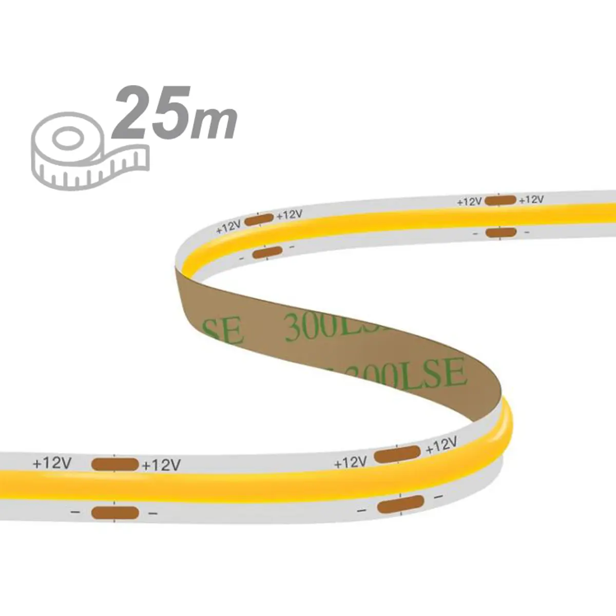 Fita LED COB de 12VDC com comprimento de 25 m, iluminação contínua, 1500 lm/m e 9,6 W/m. Oferece branco frio 6000-6500K com CRI >70Ra, ângulo de abertura de 120°, IP20 para uso interior, dimensões 25000x8mm; ideal para iluminação discreta e de alto desempenho.
