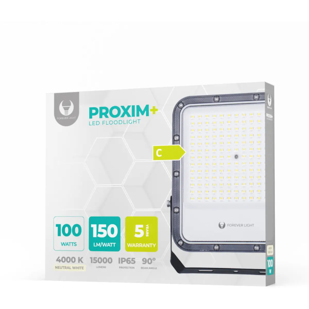 Classe energética C | Eficiência 150 lm/WO Projetor PROXIM + LED é a solução ideal para quem procura iluminação potente e eficiente. Graças aos seus componentes modernos, oferece um elevado fluxo luminoso com baixo consumo de energia.