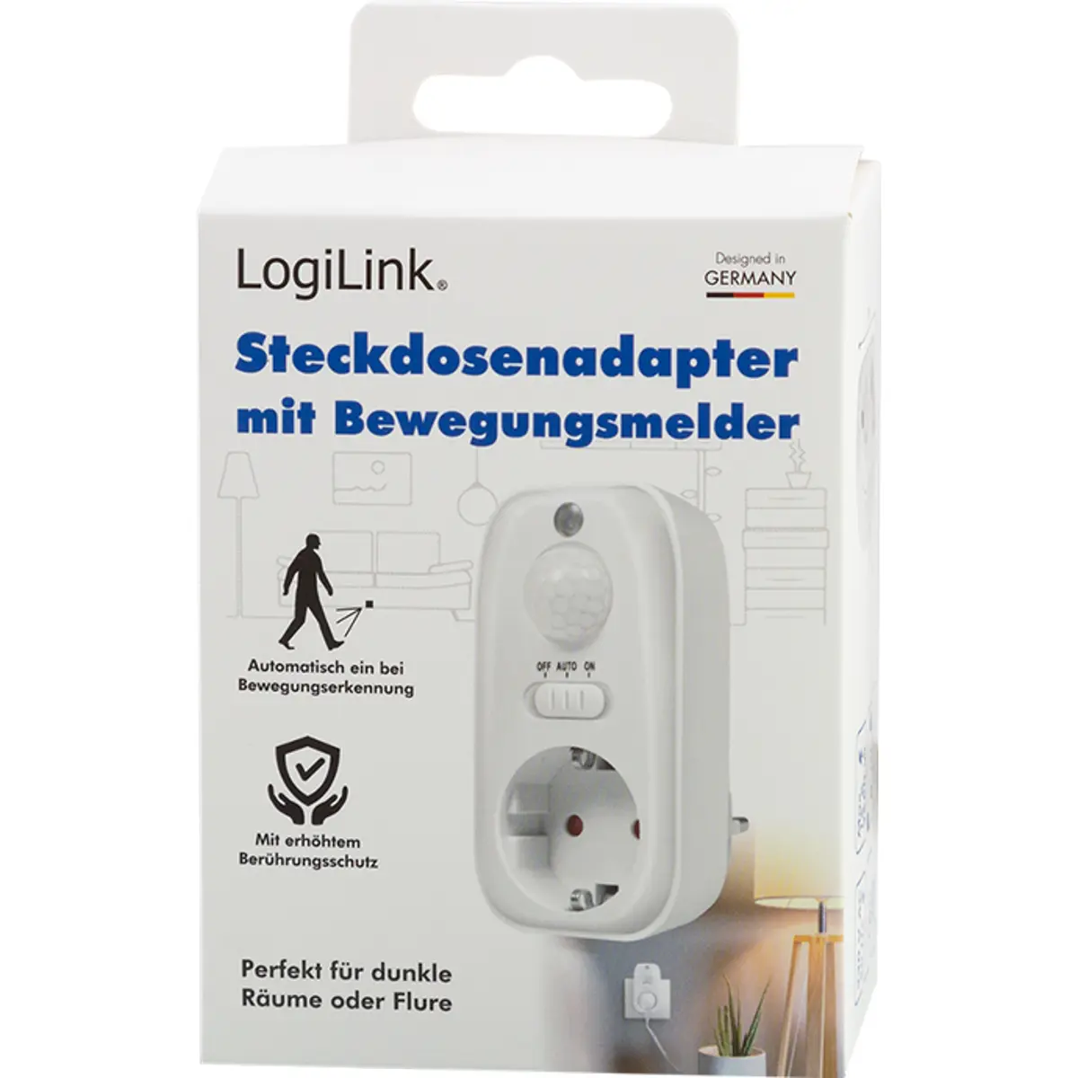 Adaptador de tomada com luz e sensor PIR (PA0248) da LogiLink, ideal para ativar automaticamente a luz quando houver movimento em áreas escuras como corredores, escadas ou garagens.