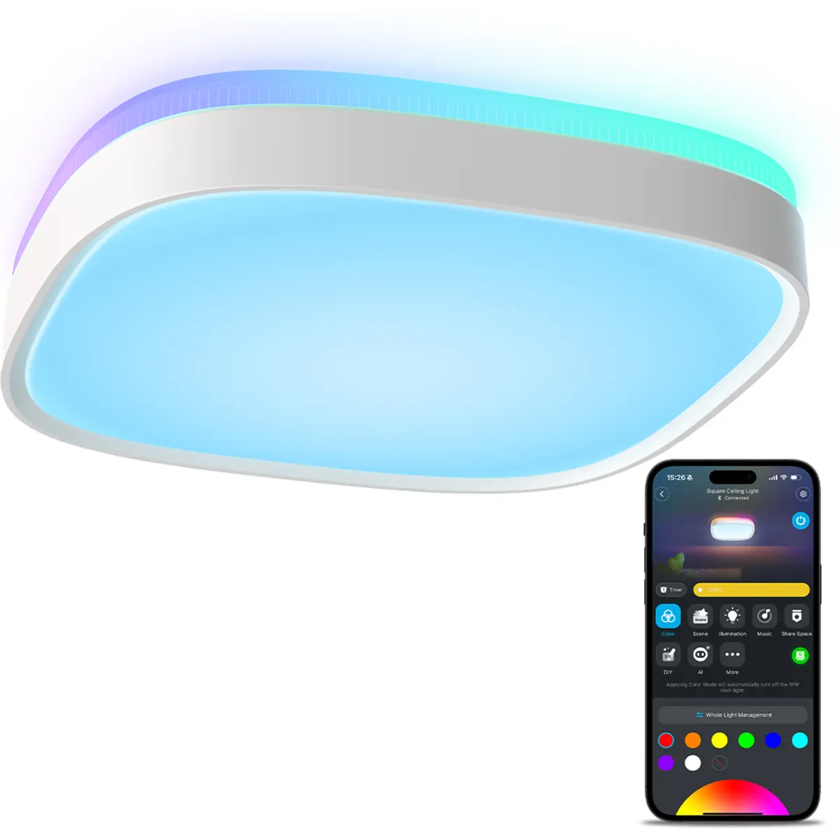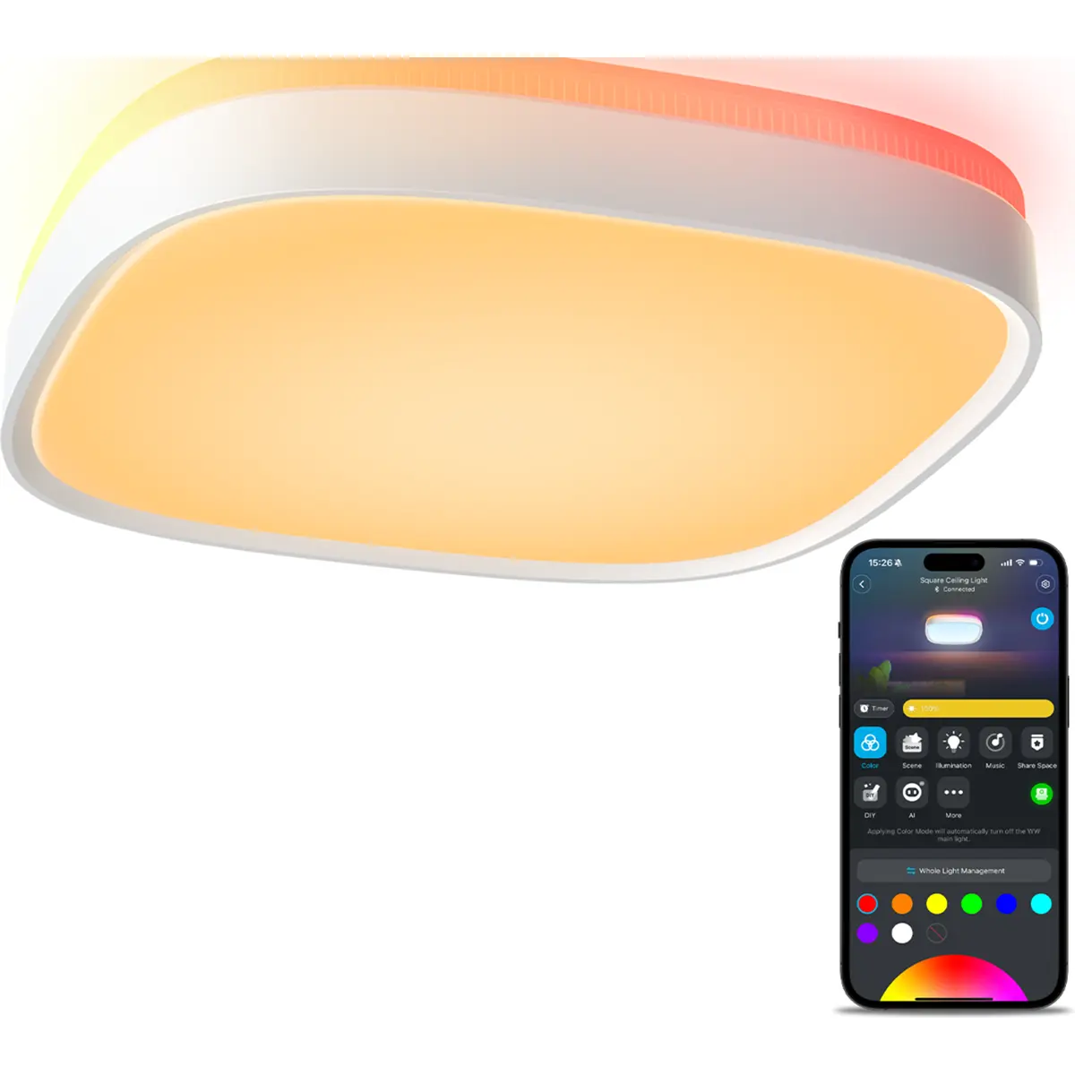 Ilumina qualquer espaço com cor e versatilidade. O plafon inteligente quadrado de 12 polegadas (31x31cm) da Govee combina luz principal RGBWW com iluminação traseira RGBIC, criando ambientes envolventes para qualquer ocasião. Ideal para divisões entre 15 a 20 m², oferece controlo total por app ou assistente de voz e mais de 70 modos de cena para personalização ilimitada.