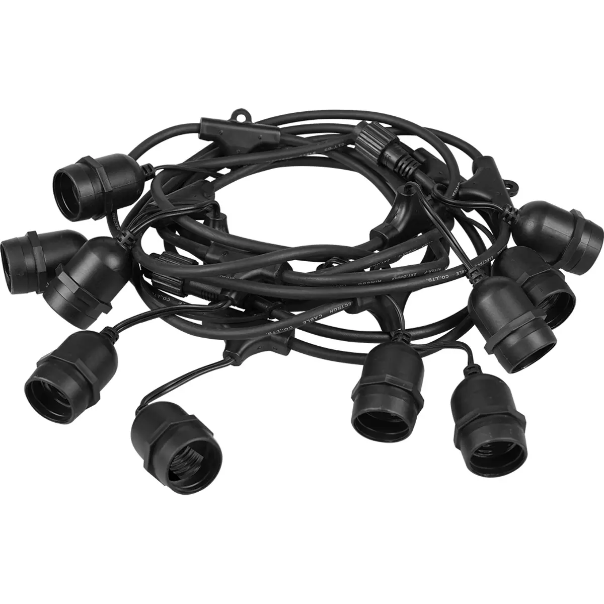 Iluminação de exterior/interior com 10 suportes E27 ao longo de 5 metros, podendo ser unida para alcançar o comprimento desejado. IP65 oferece proteção contra água e poeira; adequado para eventos, arraiais, terraços, fachadas e ambientes comerciais. Funciona a 230V/50-60Hz com potência máxima de 10W por segmento, cabo H05RN-F 2x1.0 mm2, casquilho E27 e isolamento Classe II. Montagem por suspensão facilita a instalação em estruturas verticais ou horizontais; durabilidade e versatilidade para iluminação decorativa.
