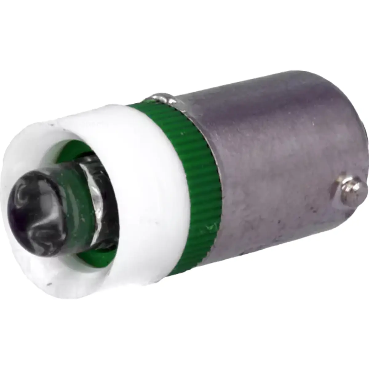 Lâmpada LED com casquilho BA9S, tensão de 24V DC/AC e luminosidade de 2000mcd. Cor verde, diâmetro Ø9.6mm e comprimento 23mm, ideal para pequenas instalações que exigem iluminação verde em sistemas DC/AC. Compatível com fontes de energia de 24V, oferece boa visibilidade e formato compacto para encaixar em espaços restritos.