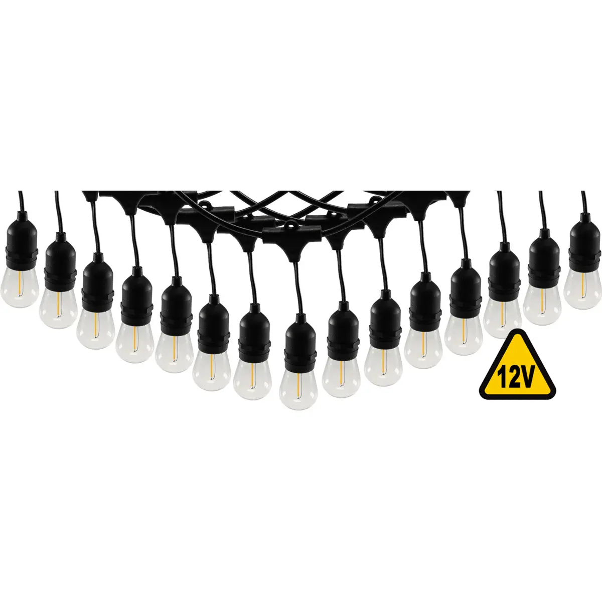 Grinalda decorativa resistente às intempéries, ideal para campismo, festas, arraiais, jardins, esplanadas, restaurantes, bares etc.. Com um comprimento total de 14 metros e luz branca quente (3000K), oferece um ambiente acolhedor e festivo. Inclui 15 lâmpadas LED de filamento com casquilho E27 a 12Vdc, segura para ambientes exteriores.