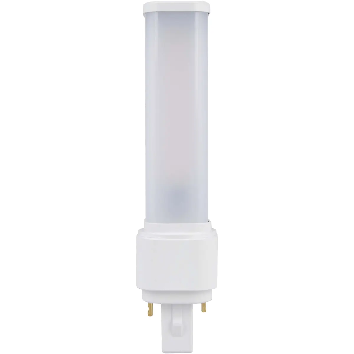Lâmpada LED de substituição com base G24d-3, PL, de 2 pinos. Possui 9 W de potência, equivalente a 26 W, fluxo luminoso de 1100 lm e temperatura de cor de 4000 K (branco neutro). Funciona a 220-240 V CA, não dimável, com ângulo de feixe de 120°, CRI 80 e fator de potência 0,9. Vida útil de 30.000 horas e classe energética E. Ideal para ambientes que exigem eficiência energética.