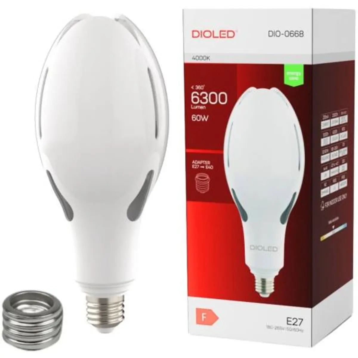 - Compatível com casquilhos E27 e E40 (adaptador incluído)
