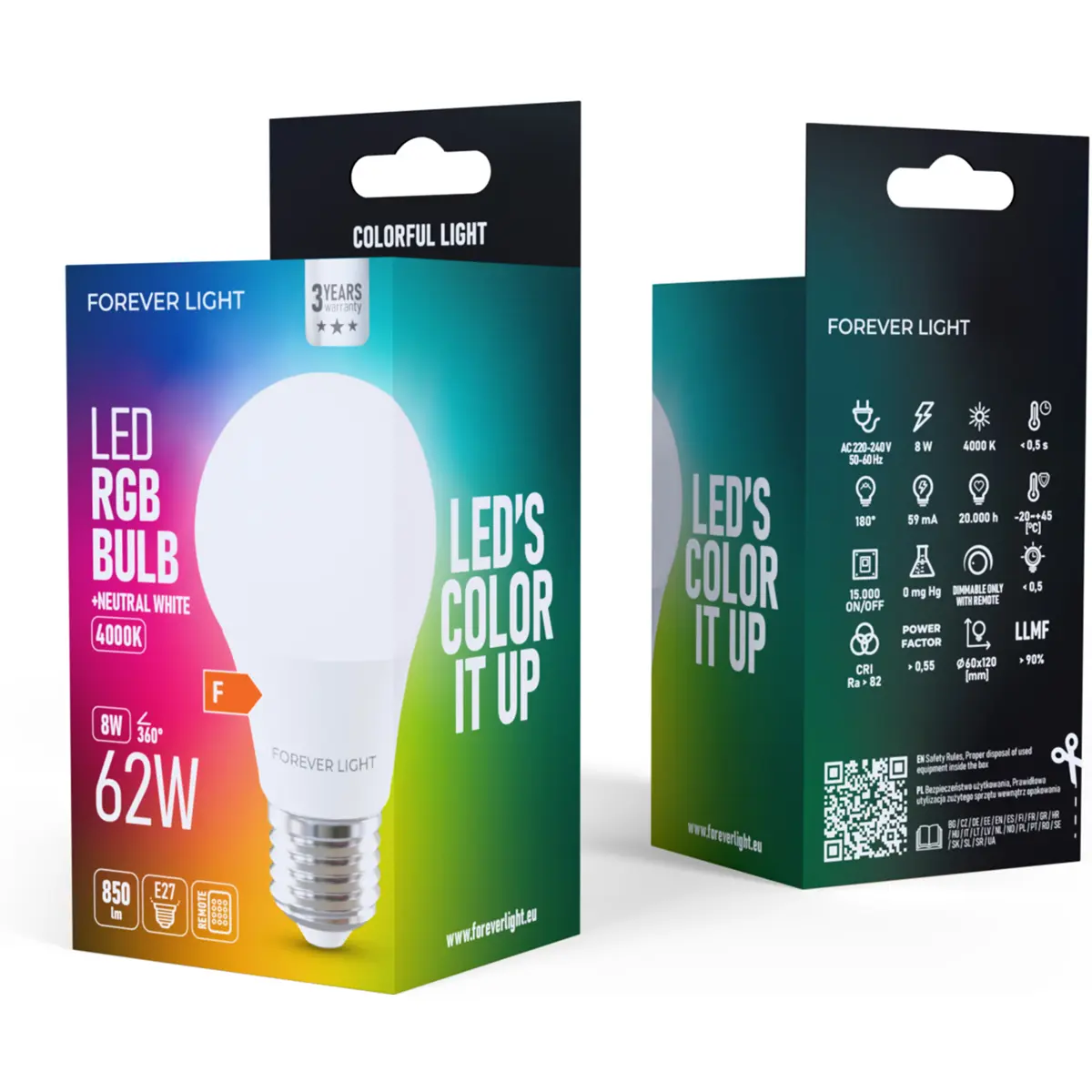 Forever - Lâmpada E27 A60 LED 8W RGB+W (branco neutro) 850lm - c/ comando