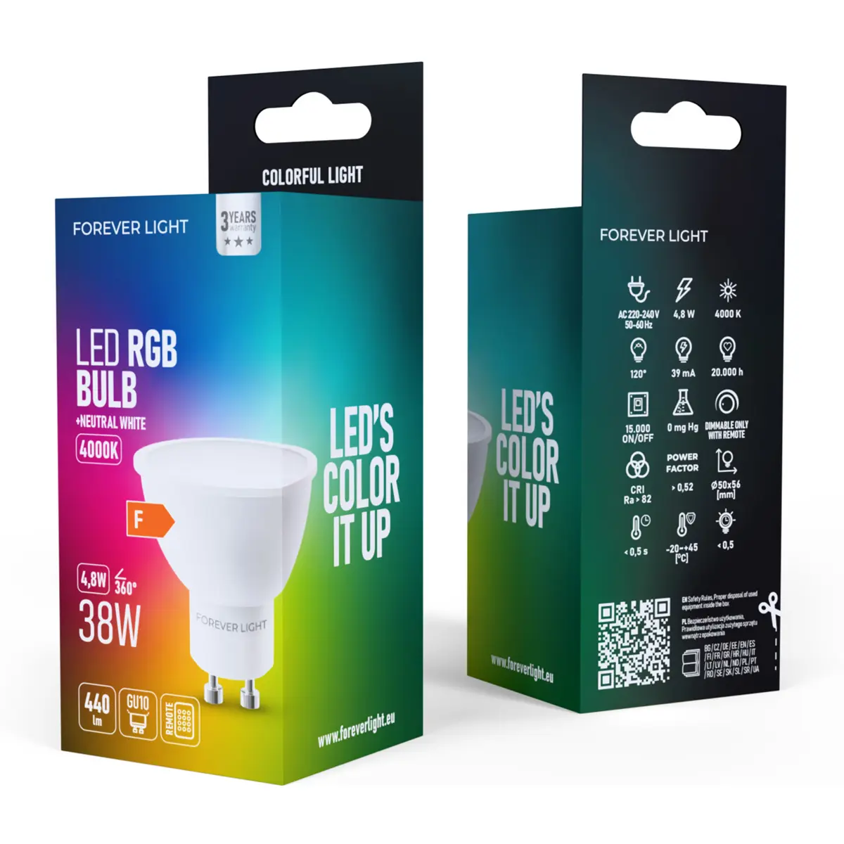 As lâmpadas LED Forever Light RGB combinam iluminação tradicional com efeitos de cor ajustáveis. O modelo GU10 4.8 W oferece luz neutra de 4000 K para uso diário, enquanto a função RGB permite criar ambientes personalizados para festas, encontros ou momentos de descanso. A tecnologia LED assegura baixo consumo energético, longa duração e compatibilidade total com base GU10. Uma solução versátil para casas, quartos juvenis, espaços de serviço e decorações luminosas.