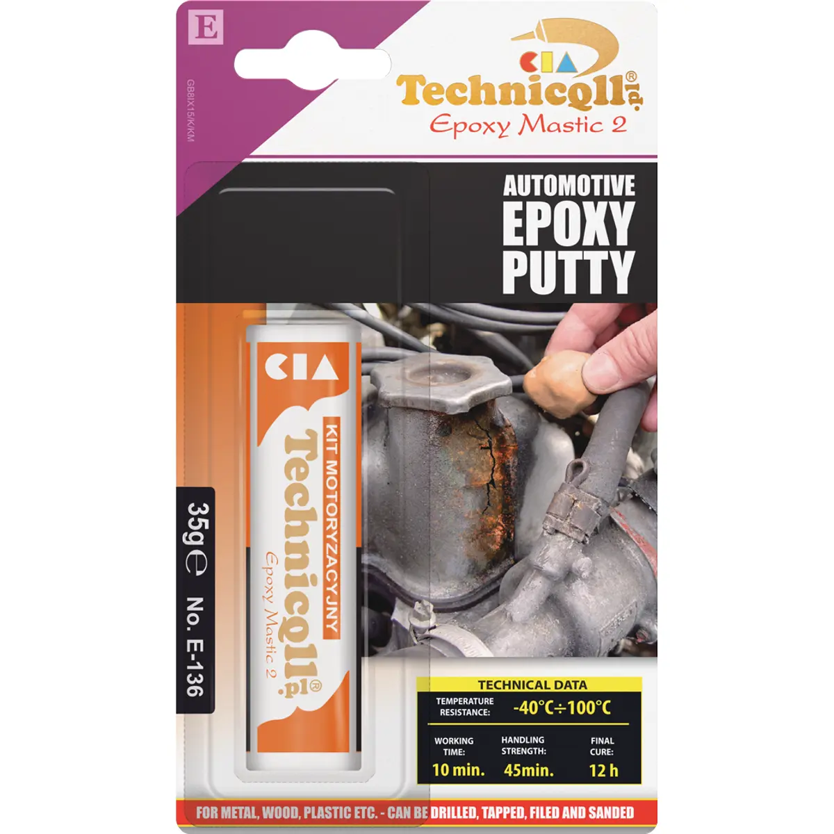 Uma massa de dois componentes de consistência de plasticina concebida para reparações de emergência em automóveis sem desmontagem. Cola, veda, preenche perdas em todos os materiais, metais (por exemplo, alumínio, ferro fundido, aço), plásticos (por exemplo, PVC, Plexiglass), vidro, madeira, pedra, etc. Resistente às vibrações, aos agentes químicos agressivos, por exemplo, à gasolina.