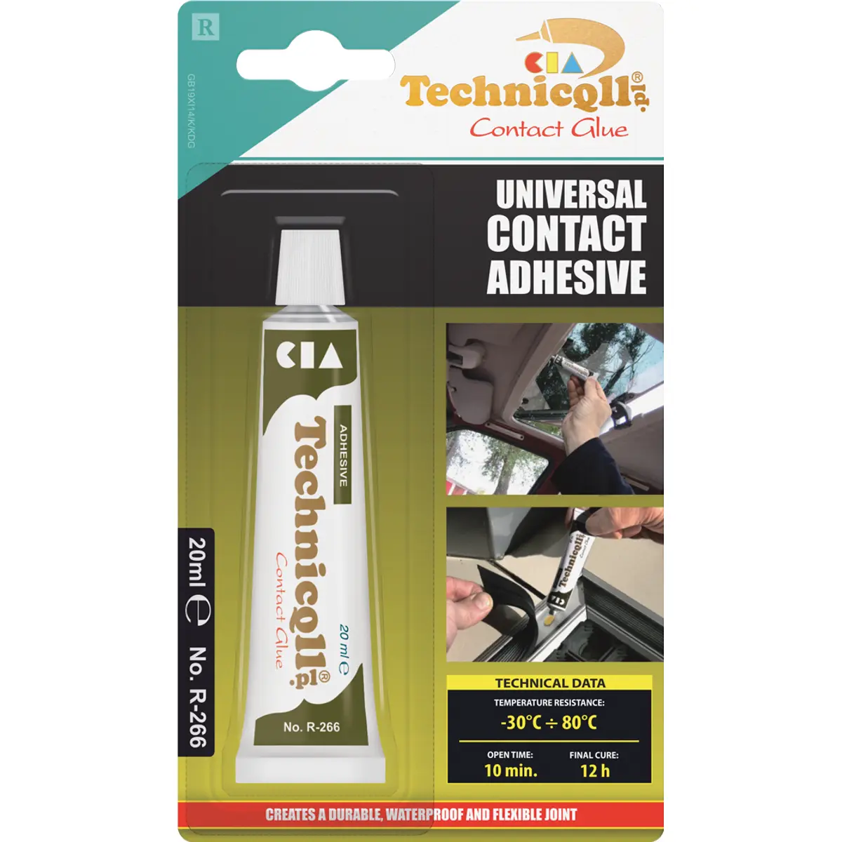 Cola de contacto universal de 20 ml, à base de policloropreno, oferece adesão forte, impermeável e elástica a materiais como borracha, plásticos, feltro, cortiça, madeira, metais e tecidos revestidos. Proporciona uma junção permanente e flexível, adequada para reparos rápidos que exigem resistência a choques e temperaturas extremas. Aplica-se em superfícies limpas e secas; o tempo aberto é de cerca de 10 minutos e a cura final ocorre em 12 horas. Funciona entre -30°C e 80°C, e deve ser armazenada entre +5°C e +25°C.