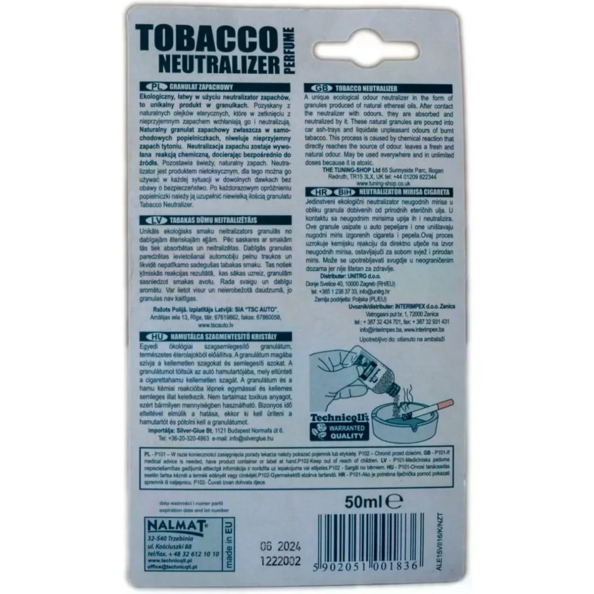 Um neutralizador de odores fácil de usar, um produto único em grânulos. Obtido a partir de óleos essenciais naturais, que em contato com um odor desagradável o absorvem e neutralizam. Este granulado, de fragrância natural, foi especialmente concebido para absorver o cheiro a tabaco dos cinzeiros para refrescar divisões ou interiores de veículos.