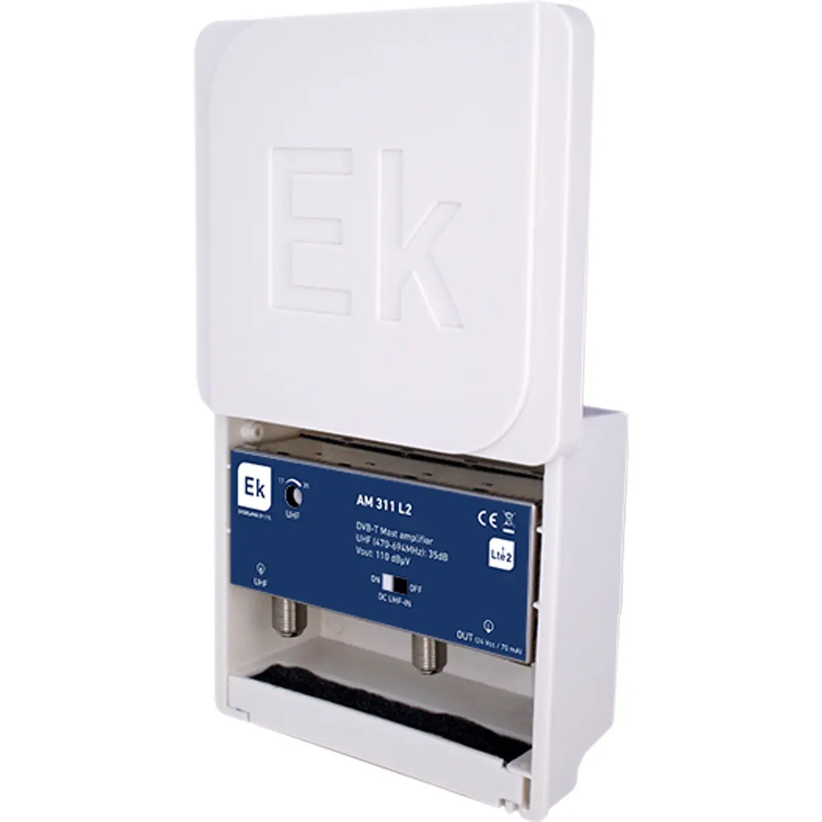 - Caixa de plástico ABS, IP23, com tampa deslizante e passa cabos coaxiais
