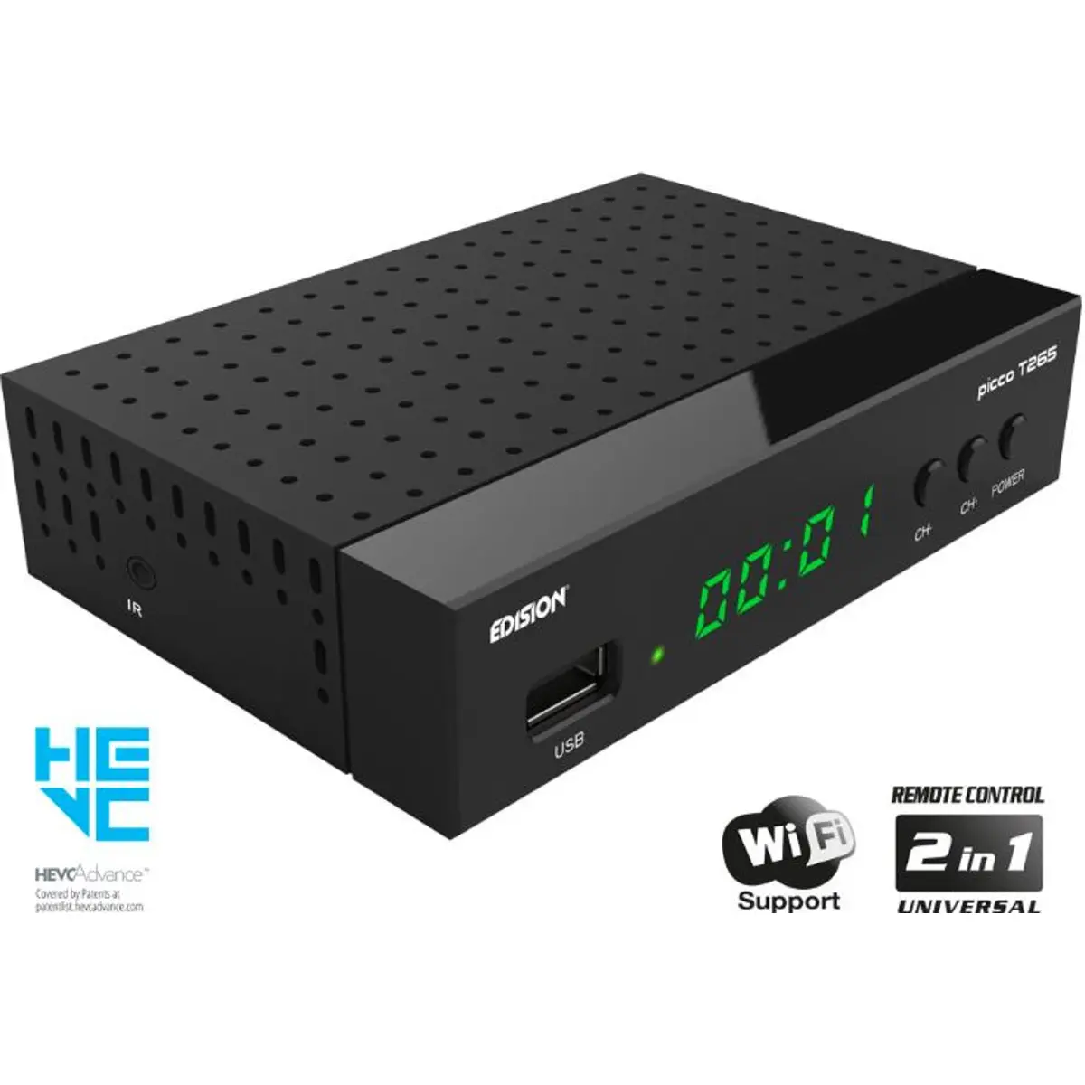 O EDISION PICCO T265 é um receptor DVB-T2 de alta definição HEVC H.265, com navegação aprimorada no menu e experiência do utilizador. Possui suporte USB WiFi para aplicativos da Internet, display LED de 4 dígitos, botões do painel frontal para ligar / desligar e canal - / + mais controle remoto universal 2-em-1 para o receptor e a TV, com quatro padrão LG / SAMSUNG configurações que também podem ser programáveis. Também possui função PVR e porta IR externa para conectar um cabo Jack-to-IR e tornar o receptor "invisível"! Seu melhor amigo de TV, com mais recursos da EDISION!